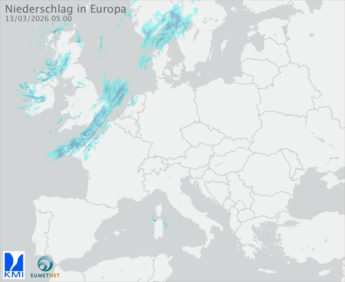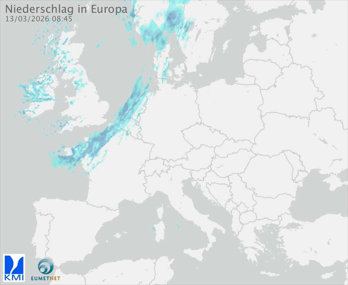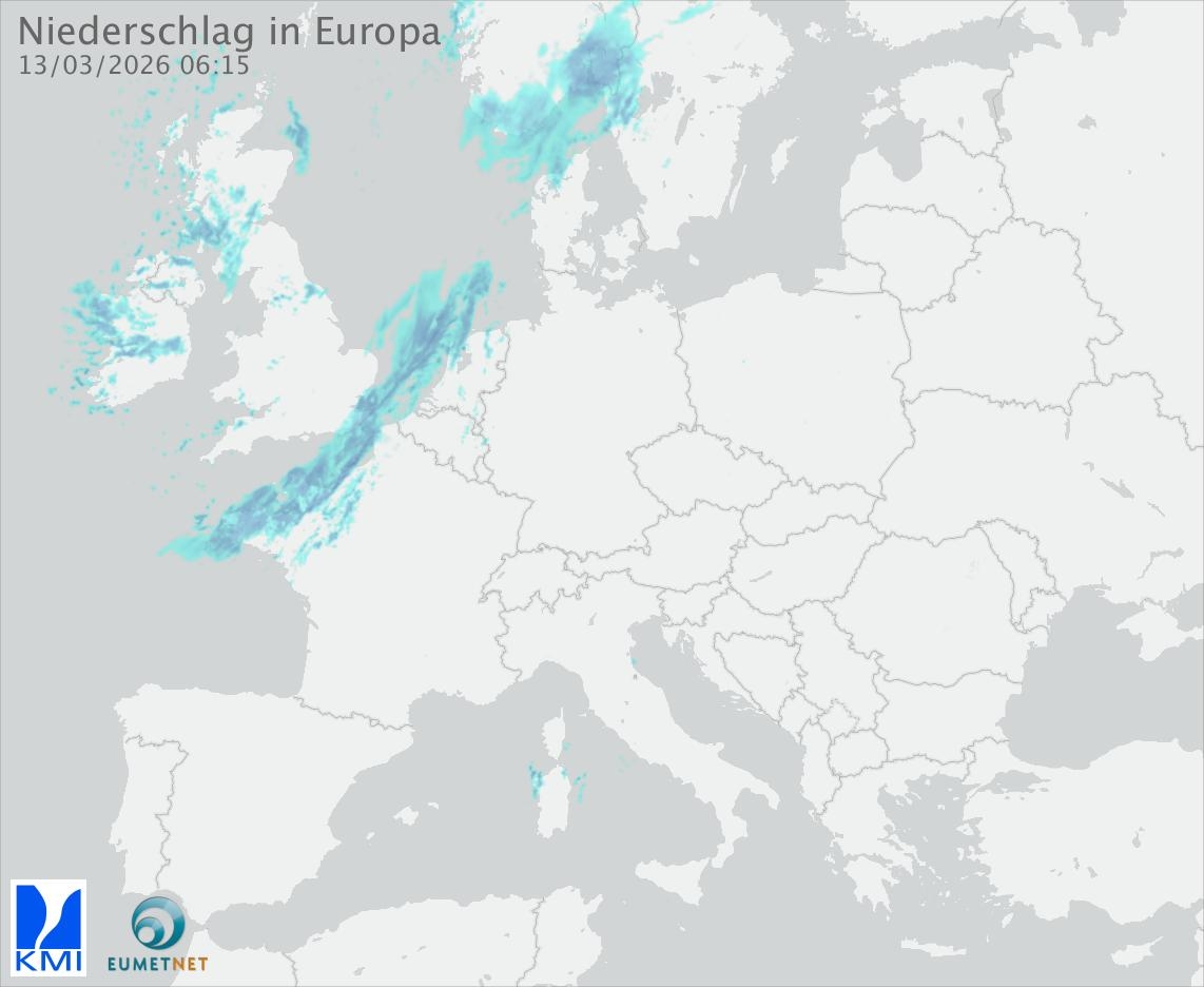 Diese Animation zeigt den gefallenen Niederschlag, gemessen durch die Regenradargeräte der europäischen Teilnehmer des Eumetnet-Programms OPERA (in 15-Minuten-Intervallen).