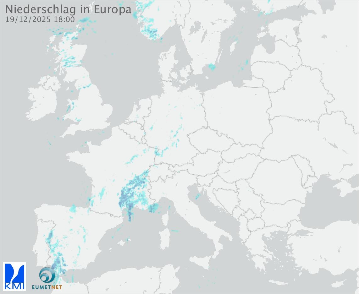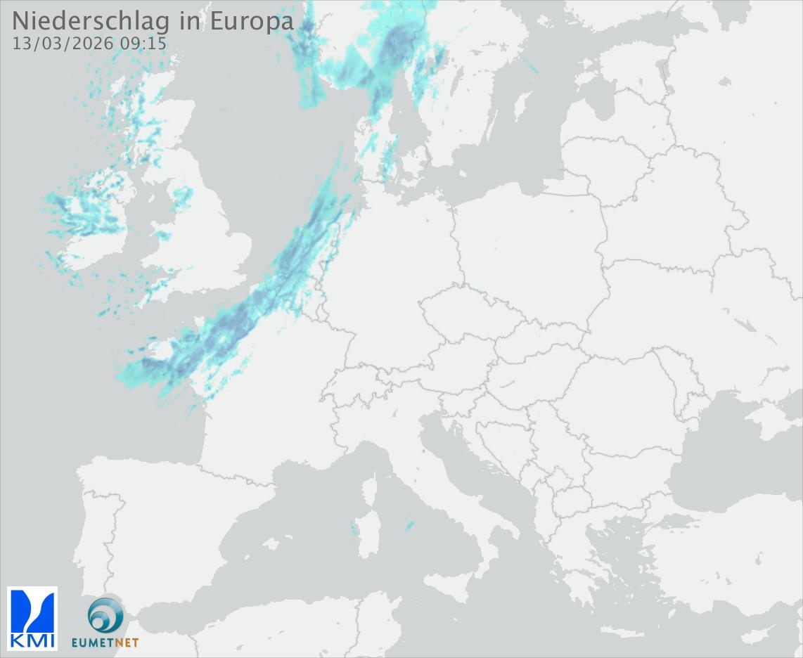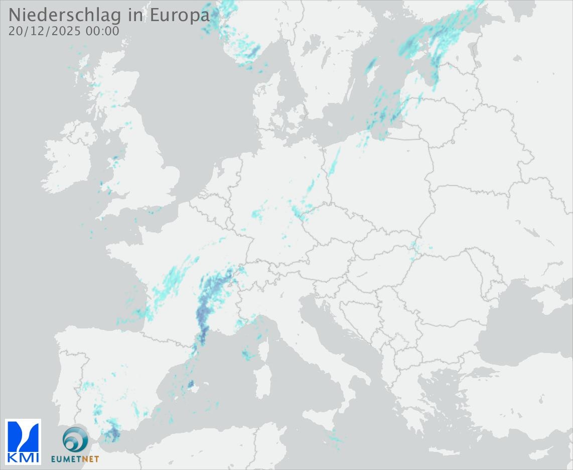 Diese Animation zeigt den gefallenen Niederschlag, gemessen durch die Regenradargeräte der europäischen Teilnehmer des Eumetnet-Programms OPERA (in 15-Minuten-Intervallen).