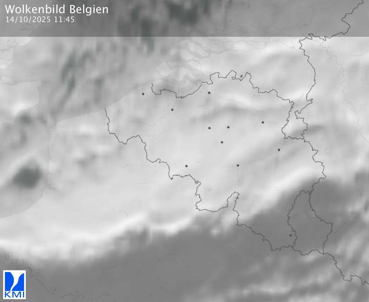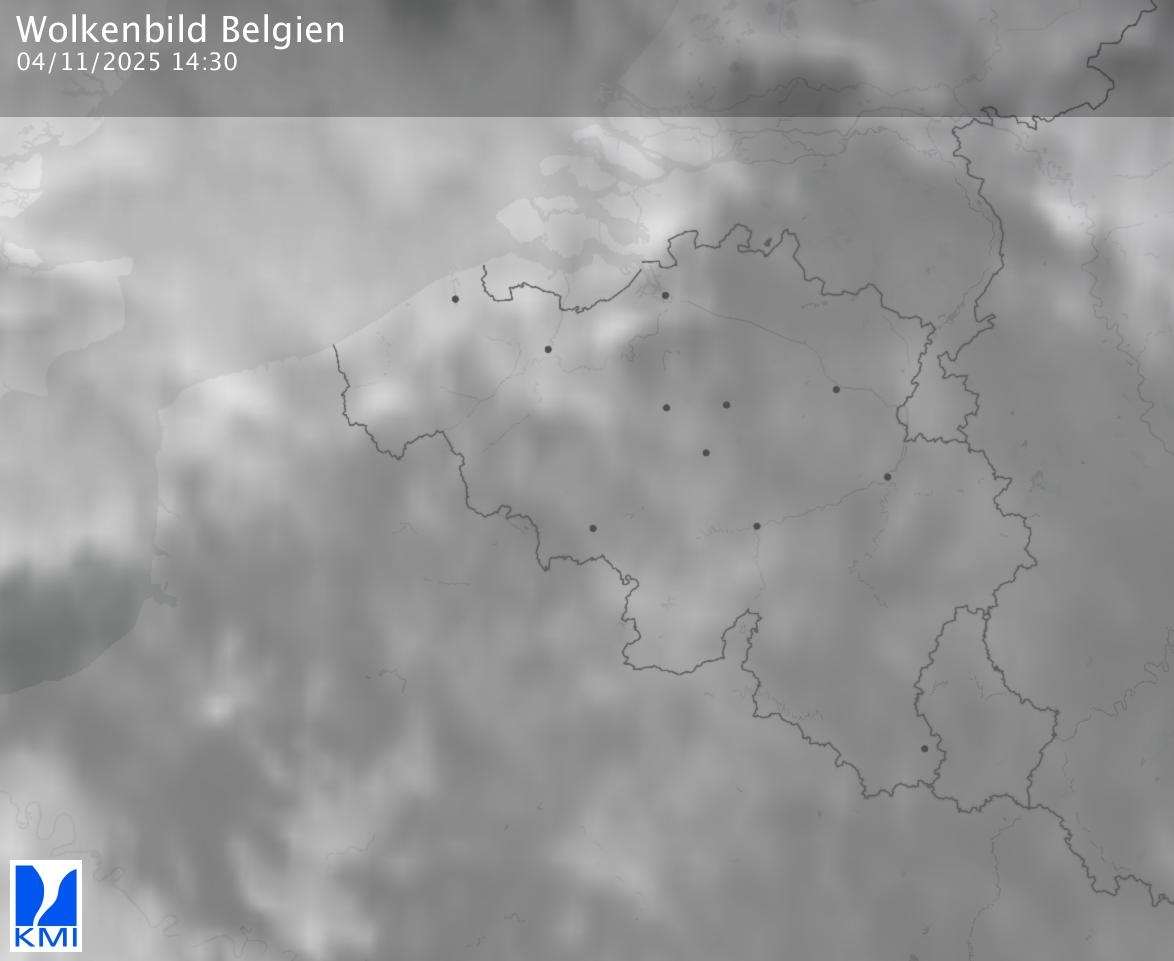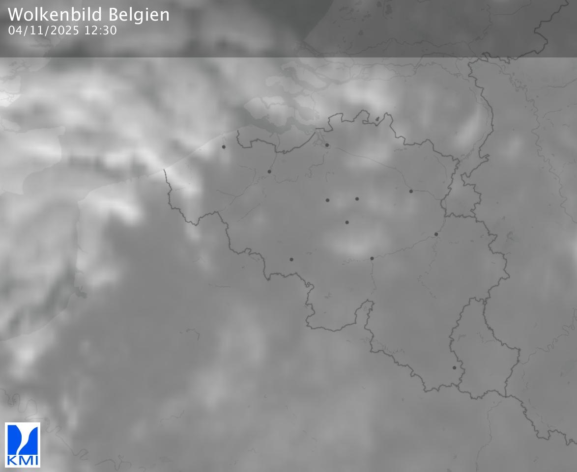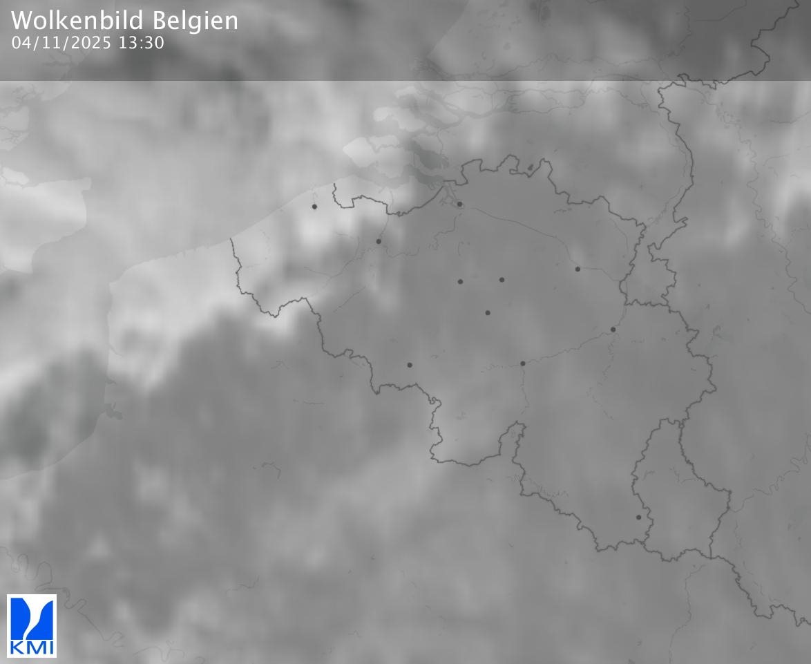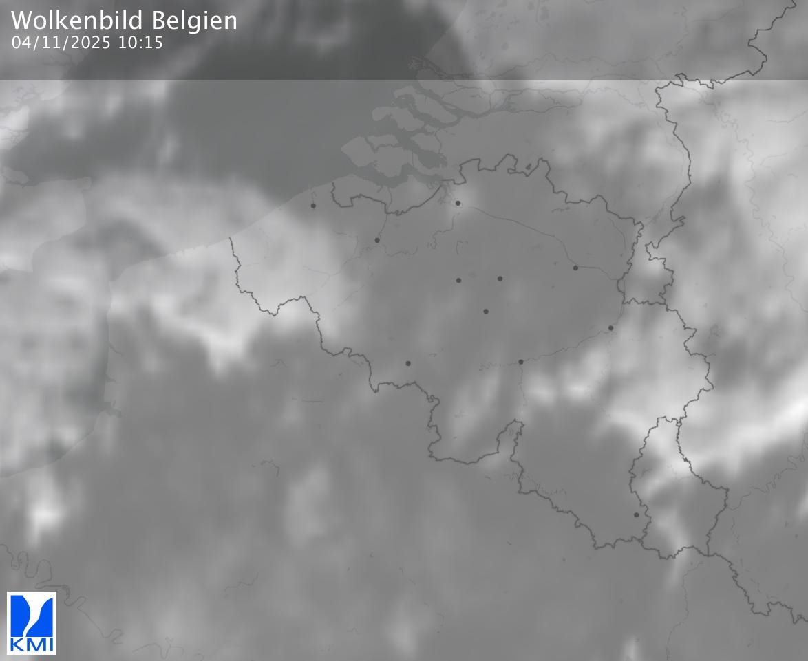 Das Wolkenbild Belgiens ist eine Kombination der sichtbaren und Infrarotkanäle des Satelliten.