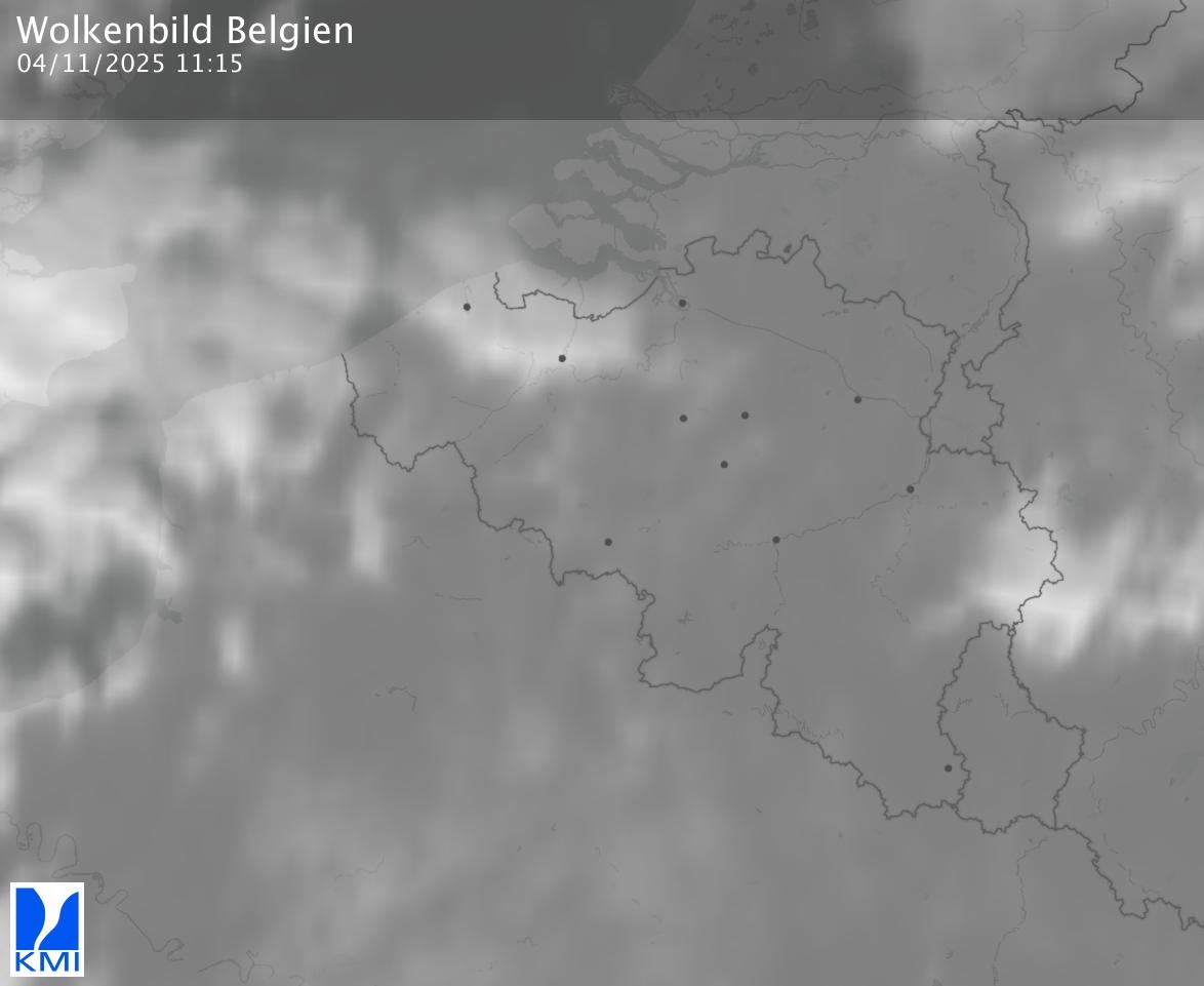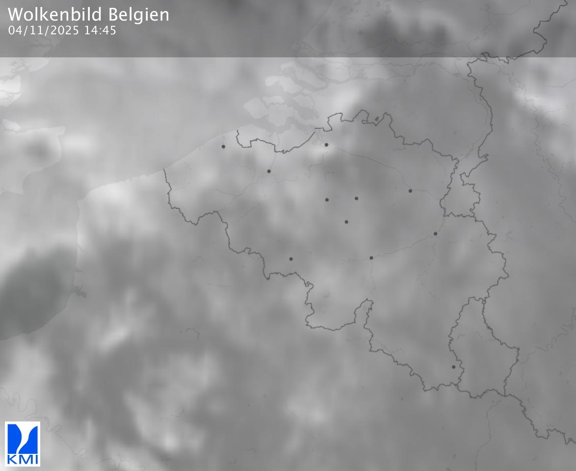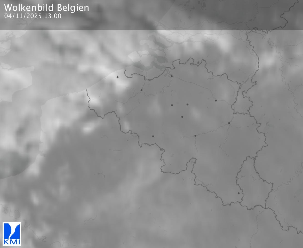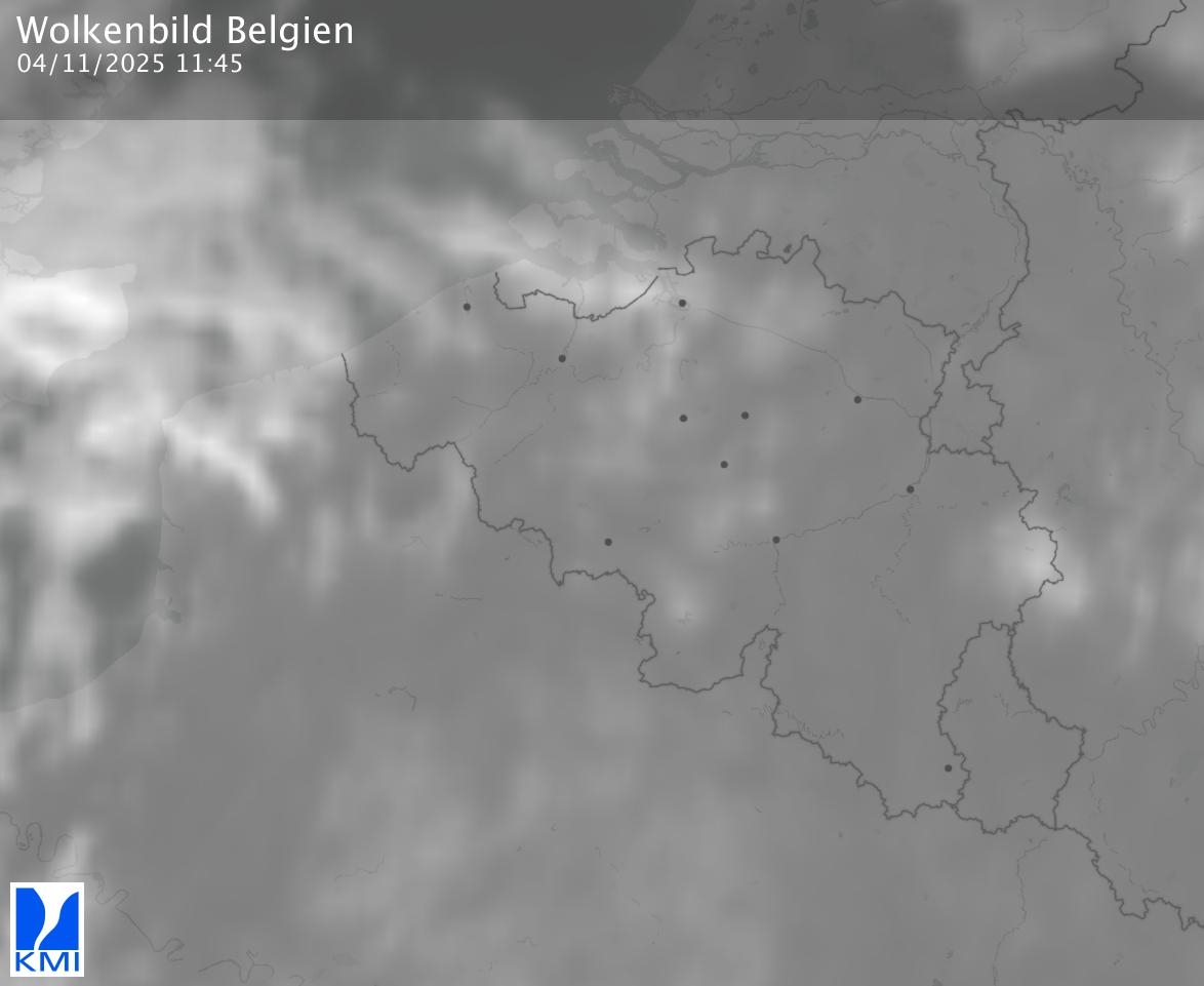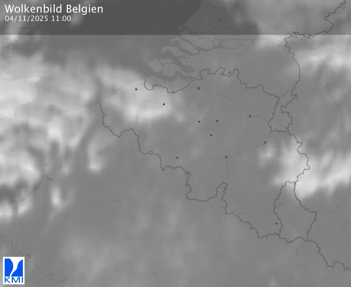 Das Wolkenbild Belgiens ist eine Kombination der sichtbaren und Infrarotkanäle des Satelliten.