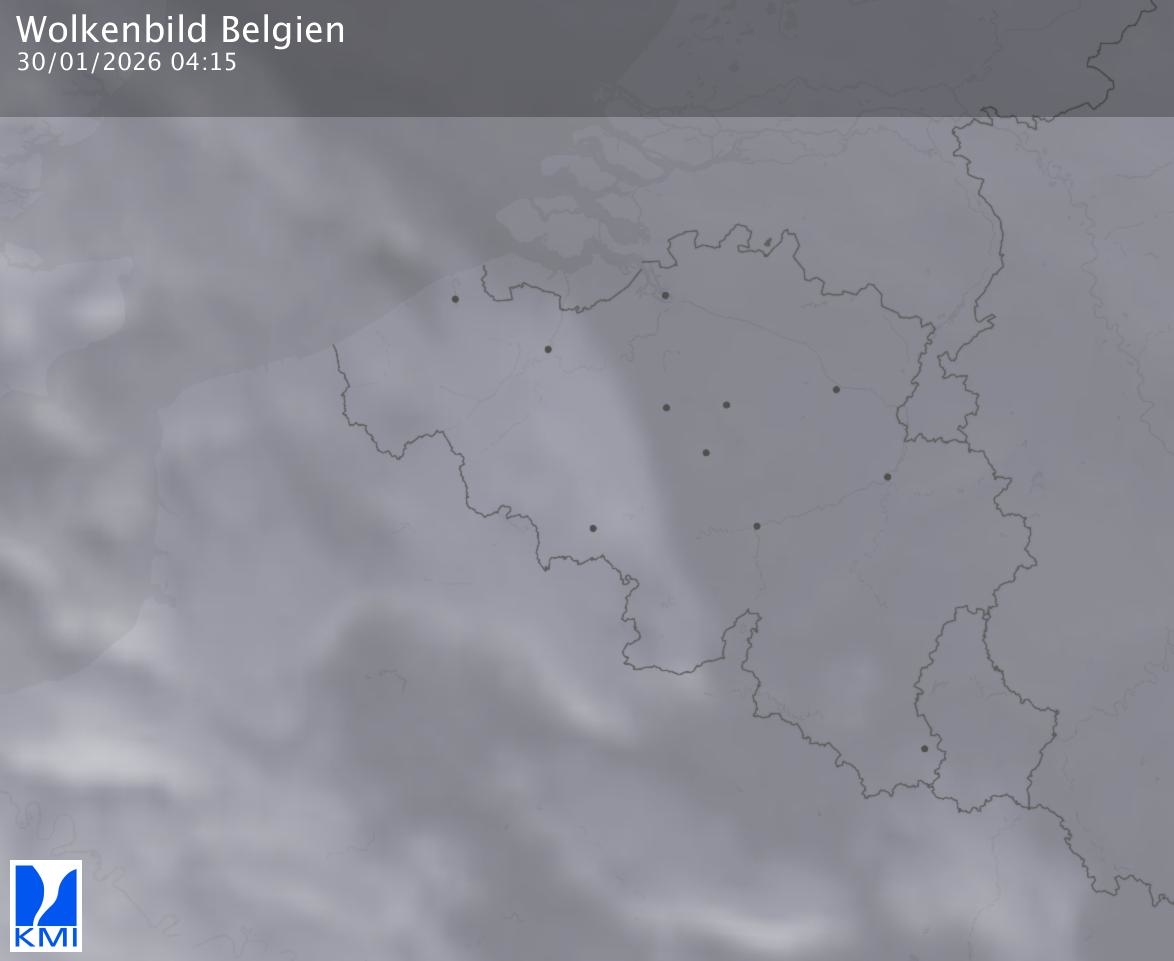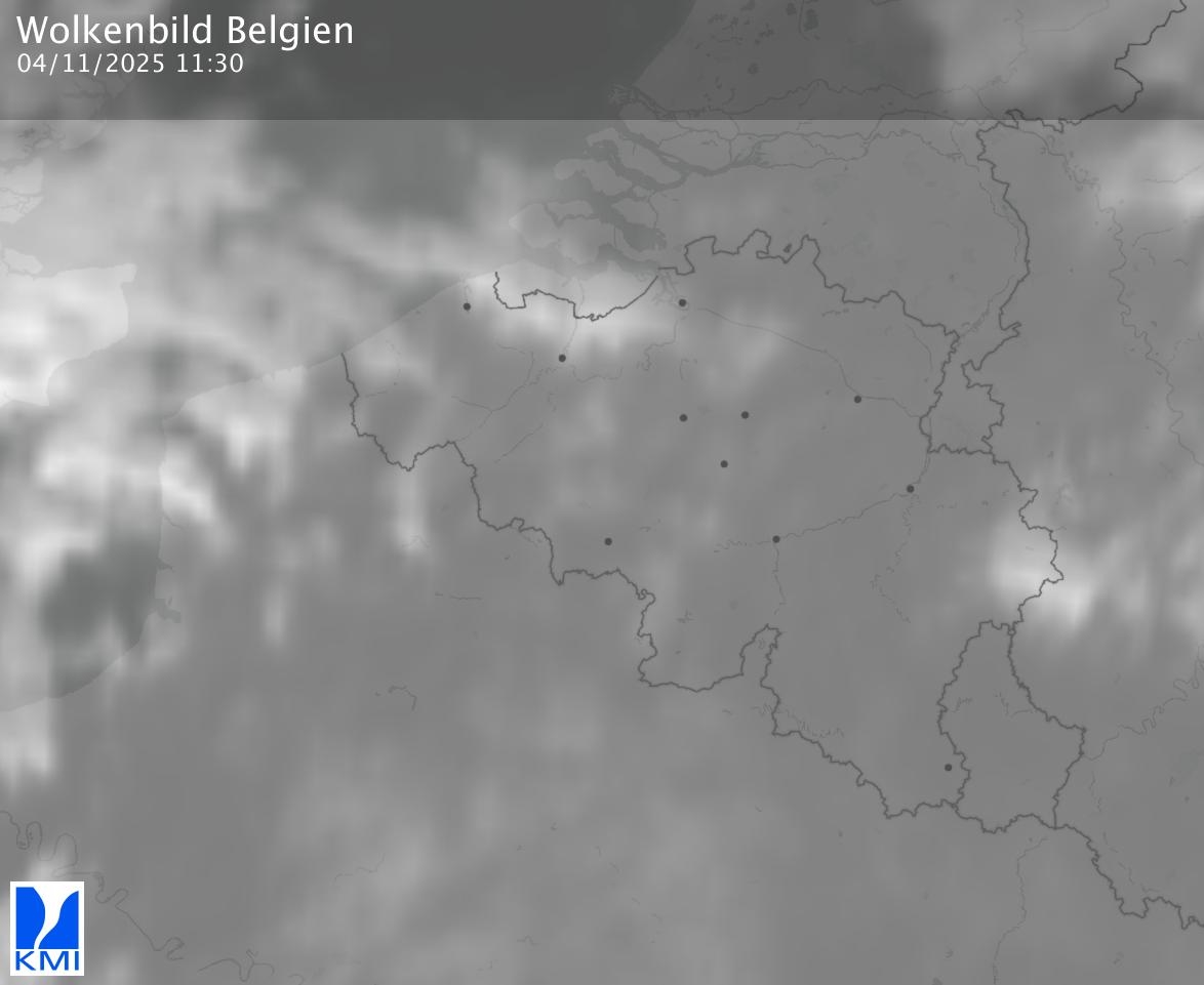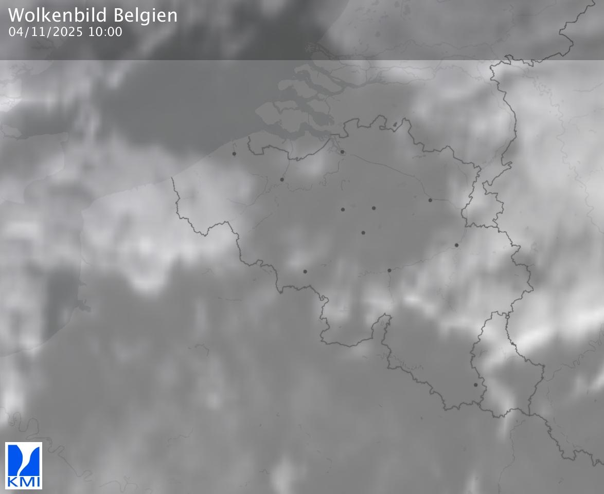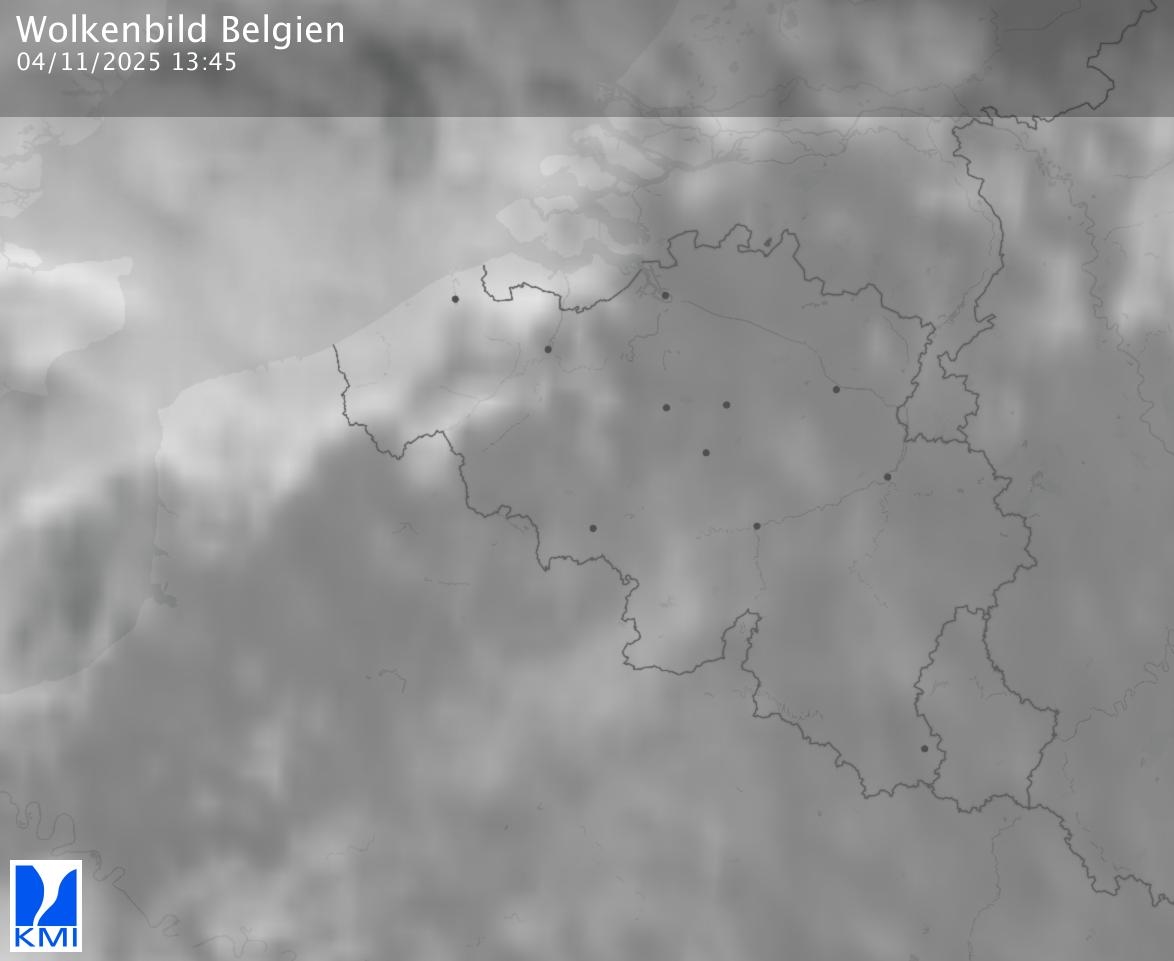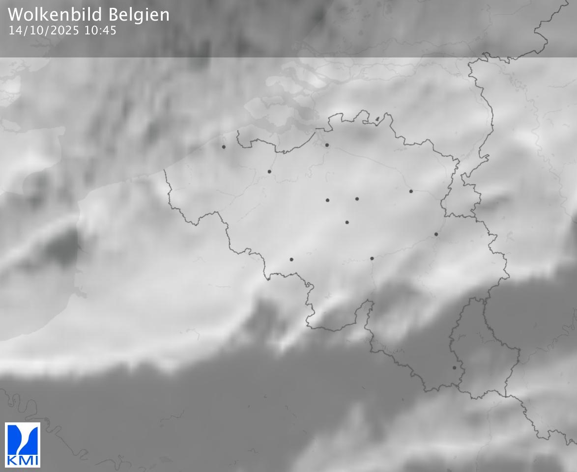 Das Wolkenbild Belgiens ist eine Kombination der sichtbaren und Infrarotkanäle des Satelliten.