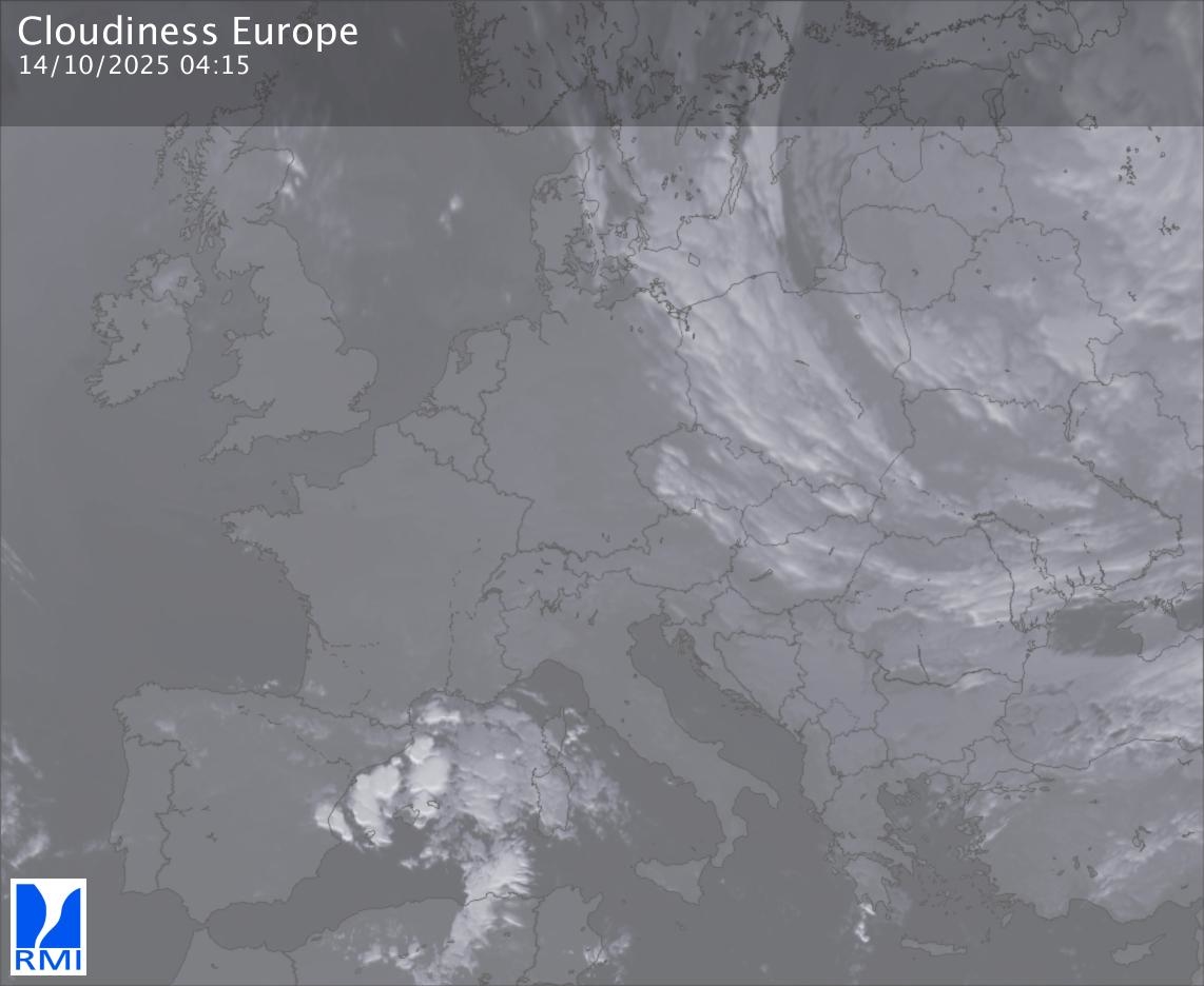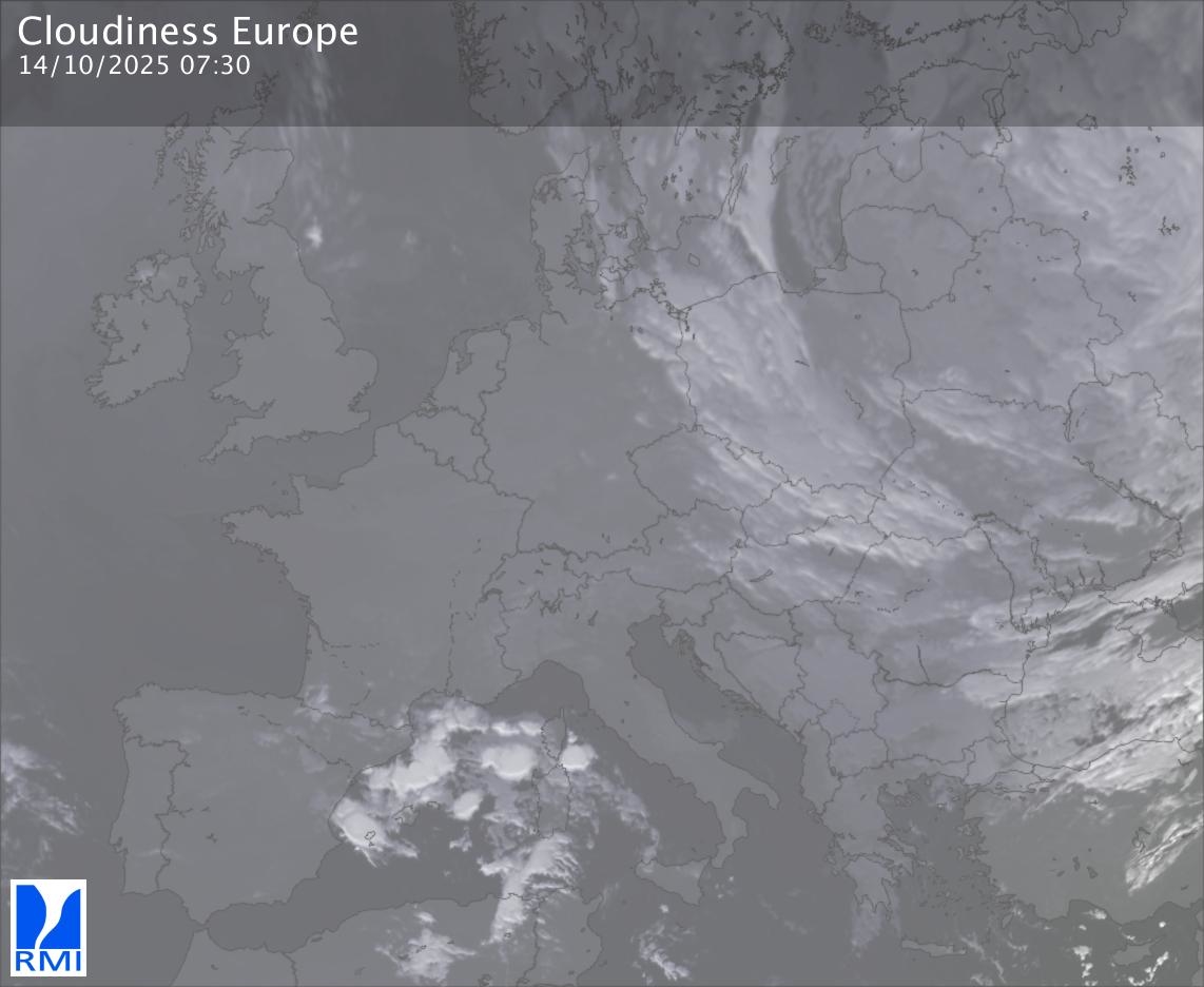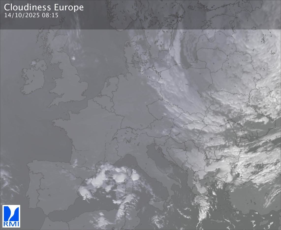 The satellite image of Europe is composed by using both the infrared and the visible light channel from the satellite. Because there are no usable visible light images during the night this composition of channels gives us an image that can be used to observe the clouds by day and by night. The pixelated artifacts are due to the lower resolution of the infrared channel.