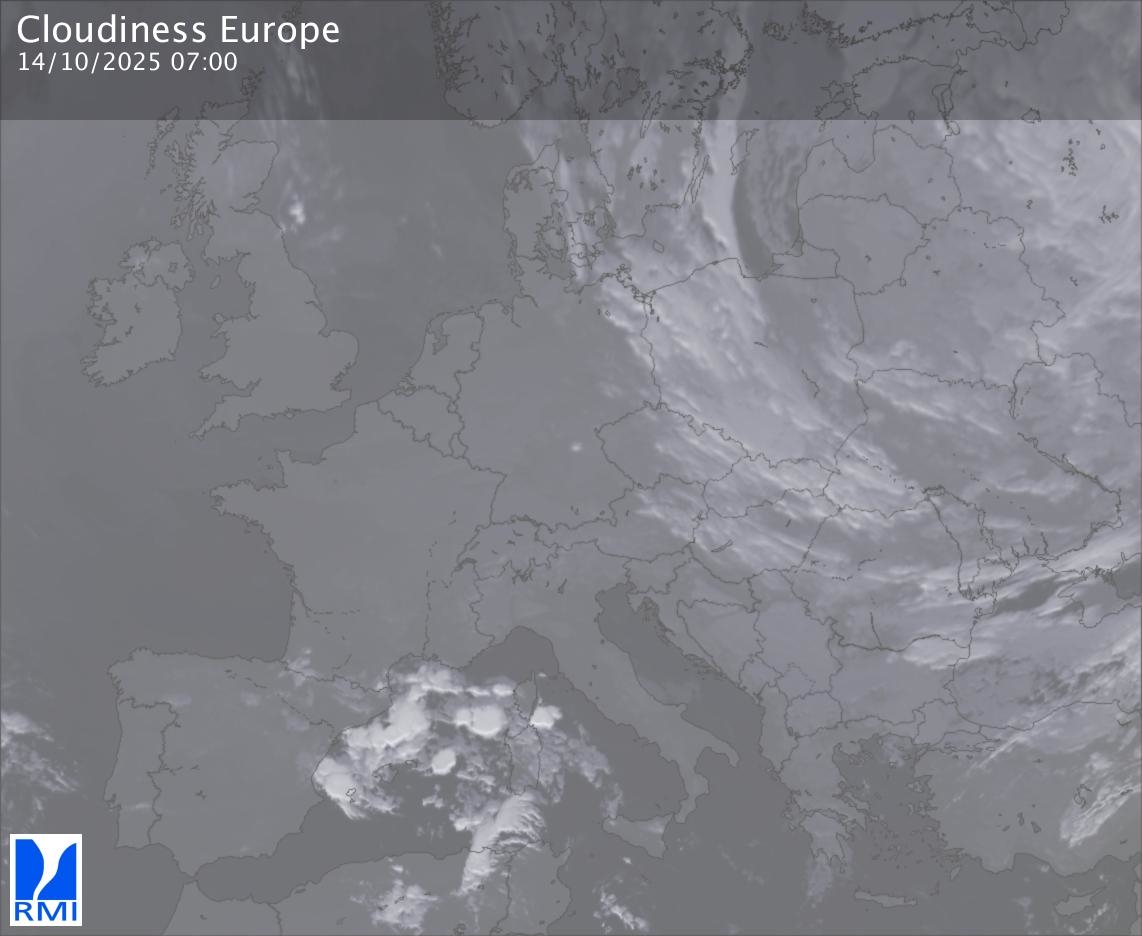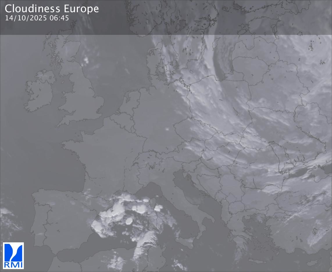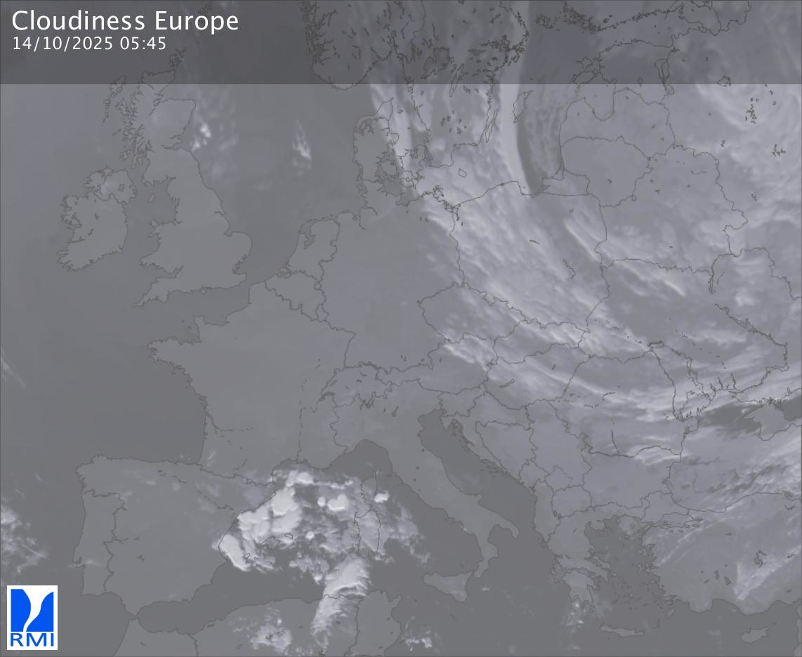 The satellite image of Europe is composed by using both the infrared and the visible light channel from the satellite. Because there are no usable visible light images during the night this composition of channels gives us an image that can be used to observe the clouds by day and by night. The pixelated artifacts are due to the lower resolution of the infrared channel.