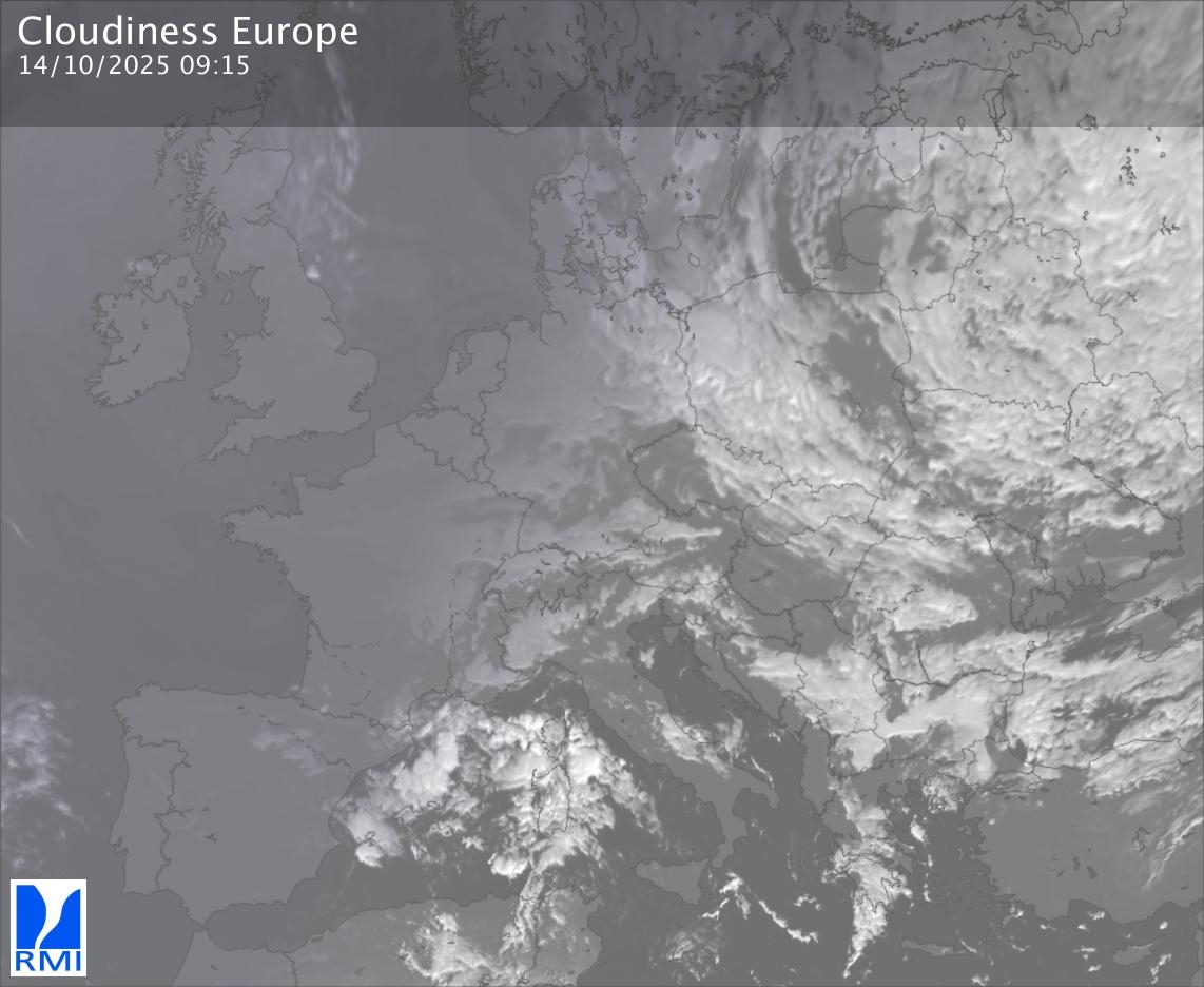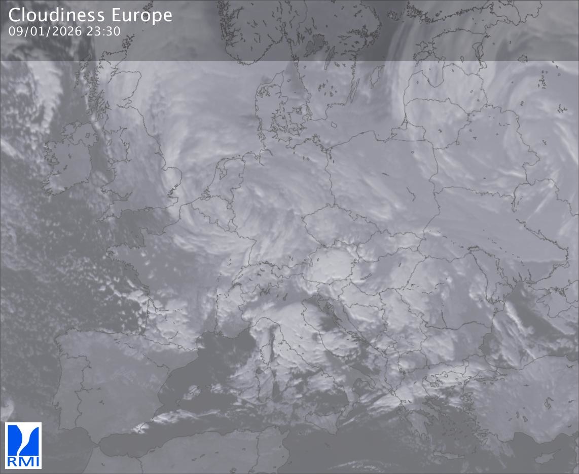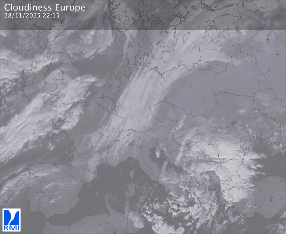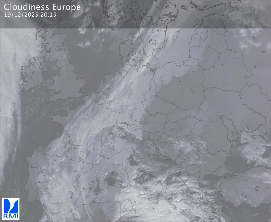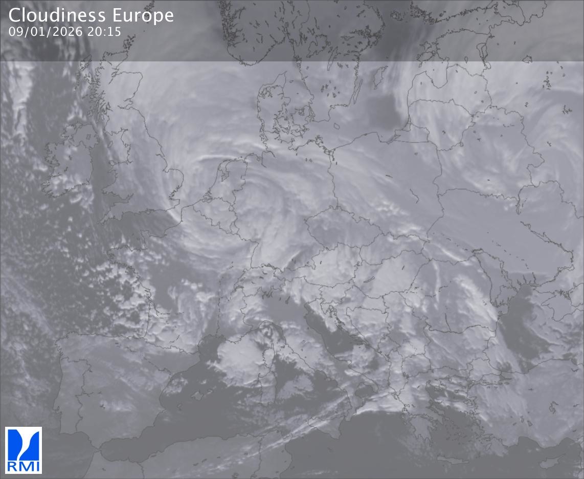 The satellite image of Europe is composed by using both the infrared and the visible light channel from the satellite. Because there are no usable visible light images during the night this composition of channels gives us an image that can be used to observe the clouds by day and by night. The pixelated artifacts are due to the lower resolution of the infrared channel.