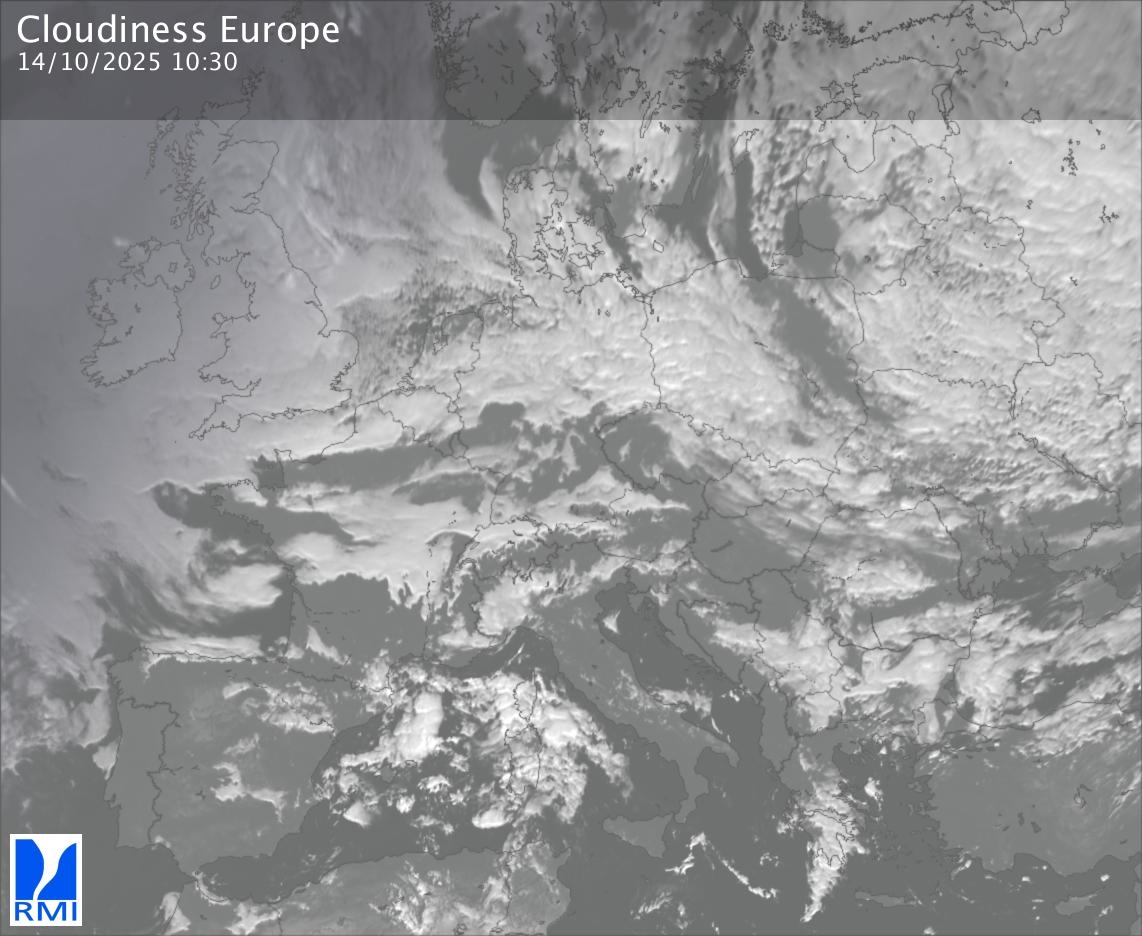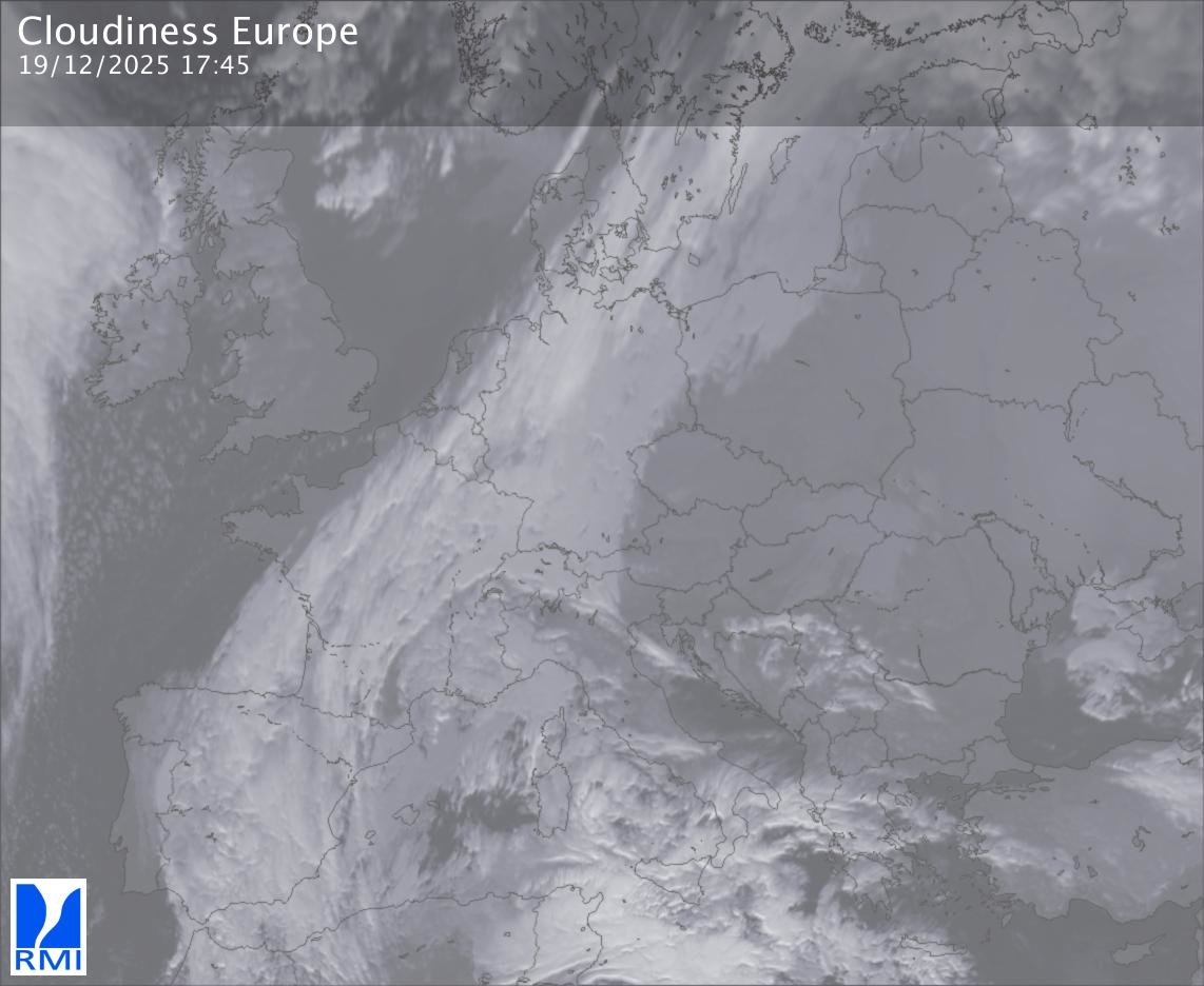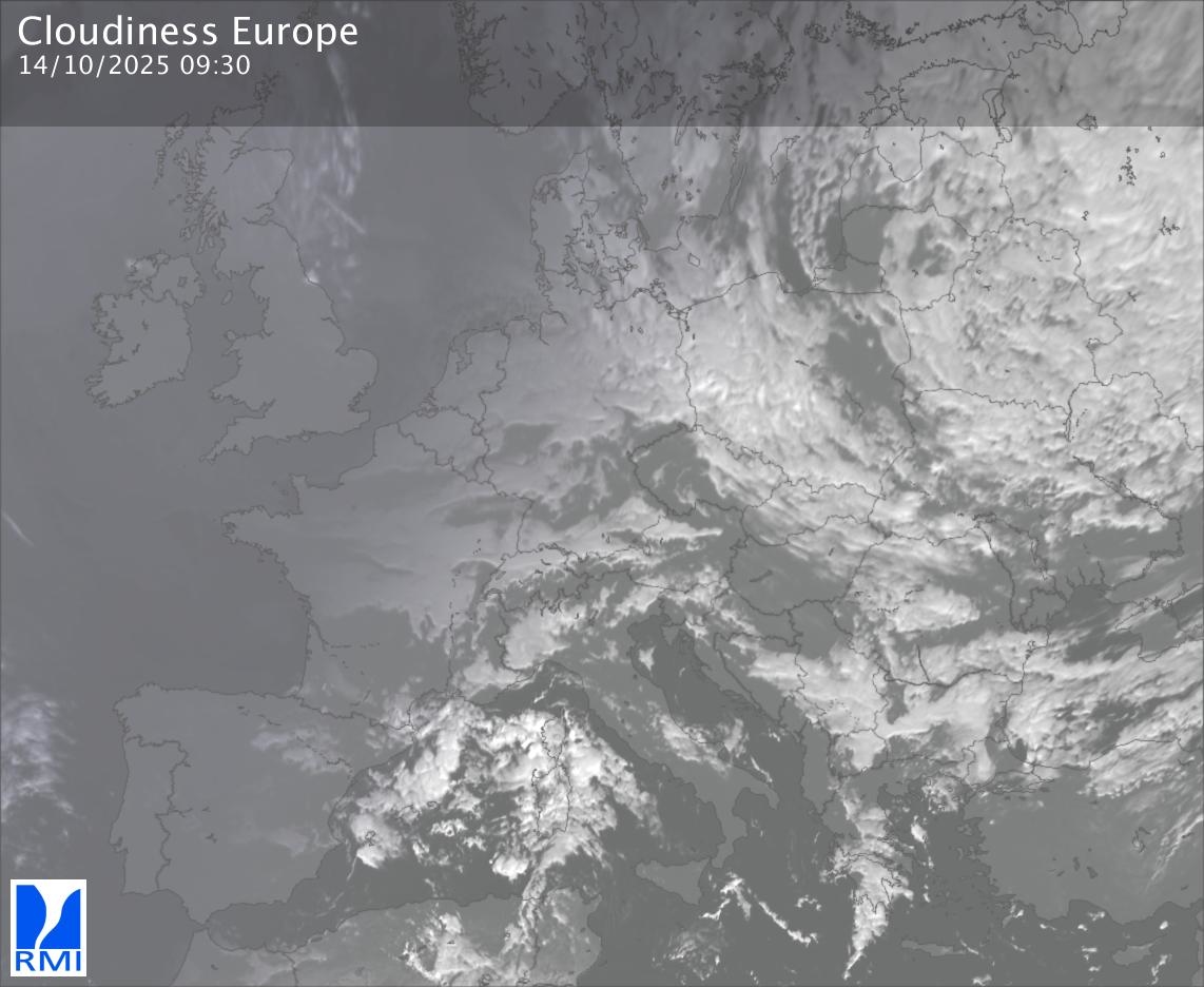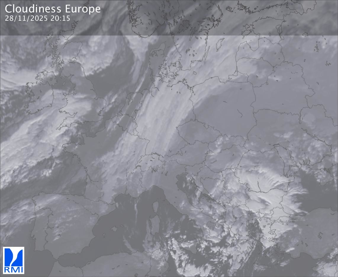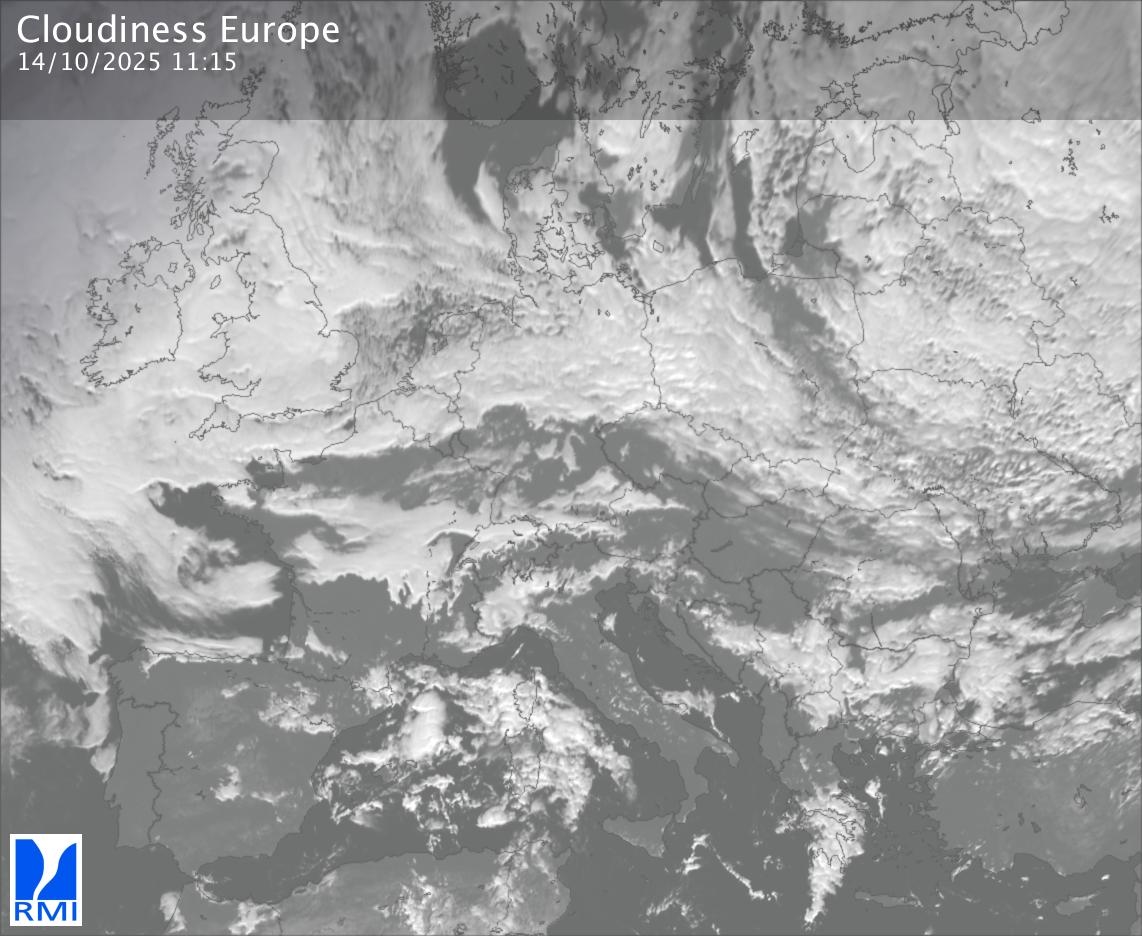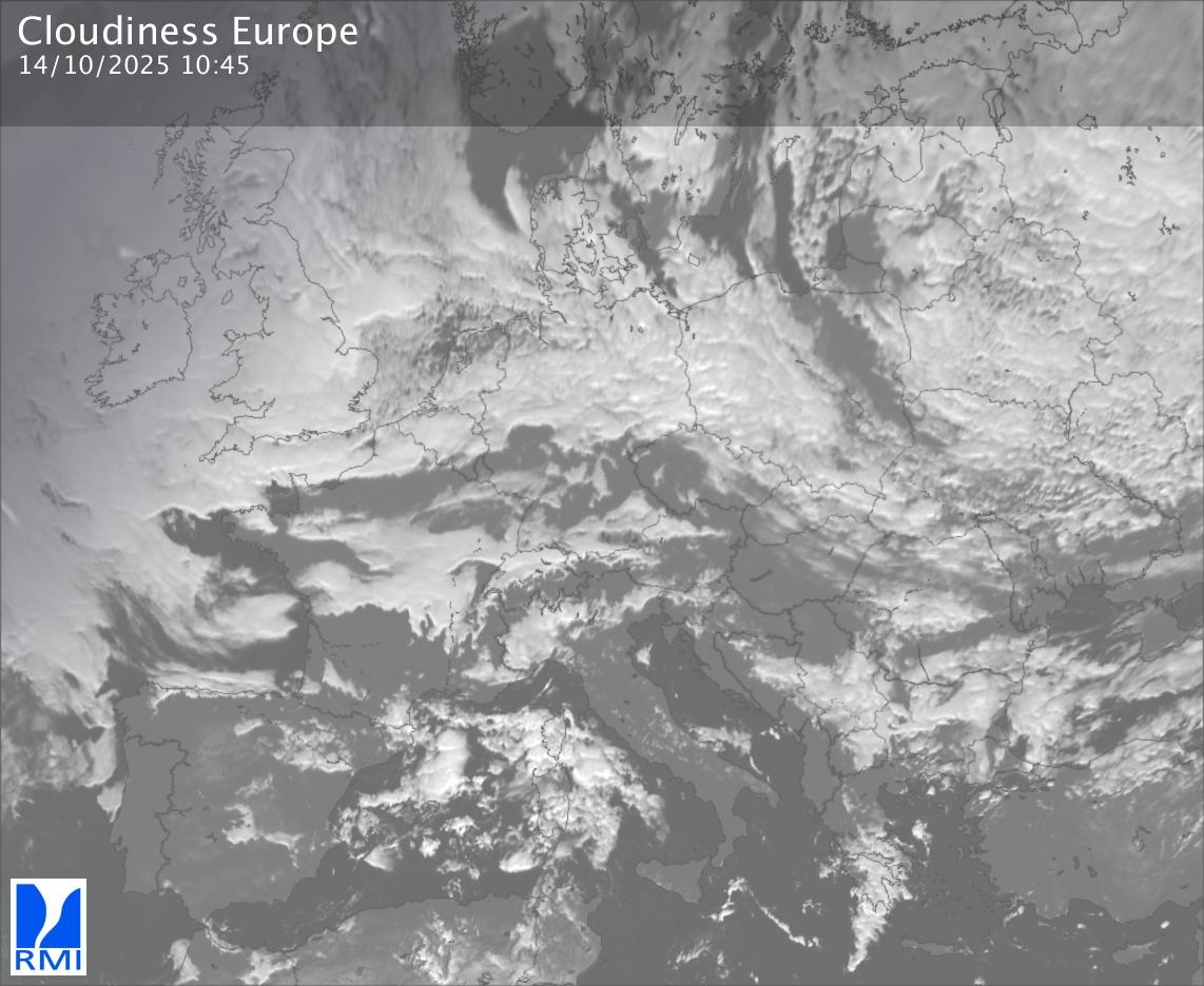 The satellite image of Europe is composed by using both the infrared and the visible light channel from the satellite. Because there are no usable visible light images during the night this composition of channels gives us an image that can be used to observe the clouds by day and by night. The pixelated artifacts are due to the lower resolution of the infrared channel.