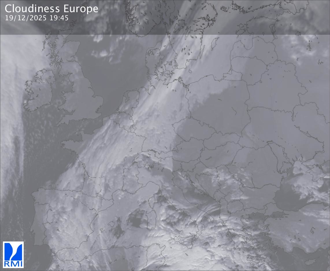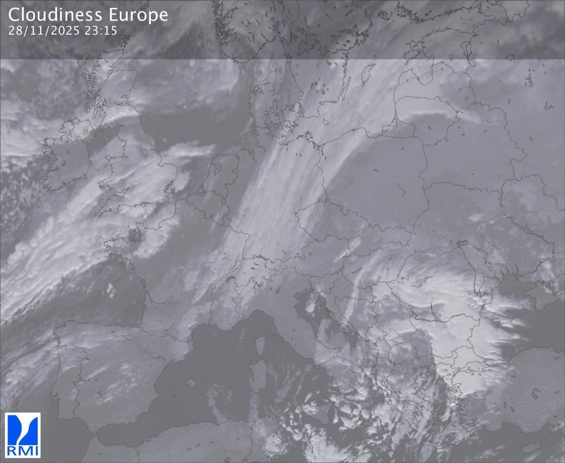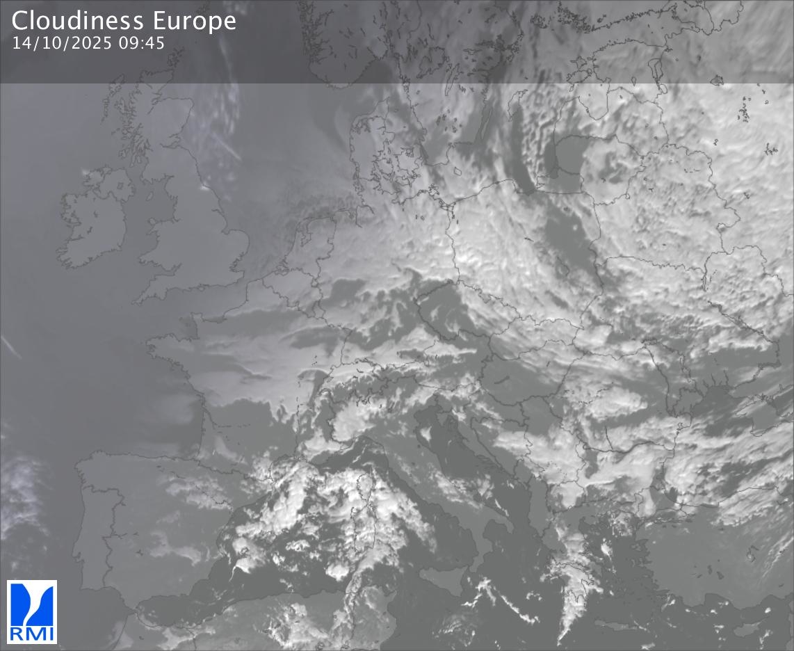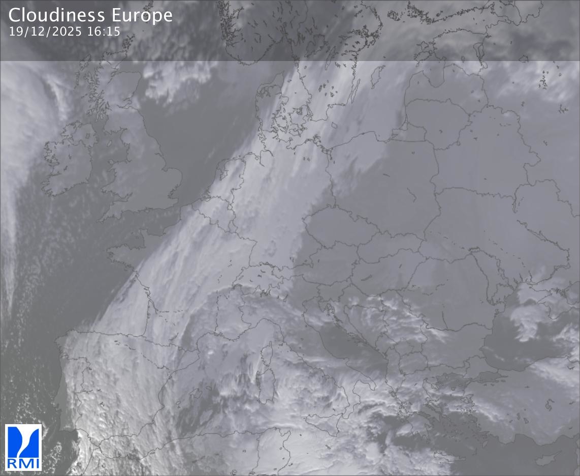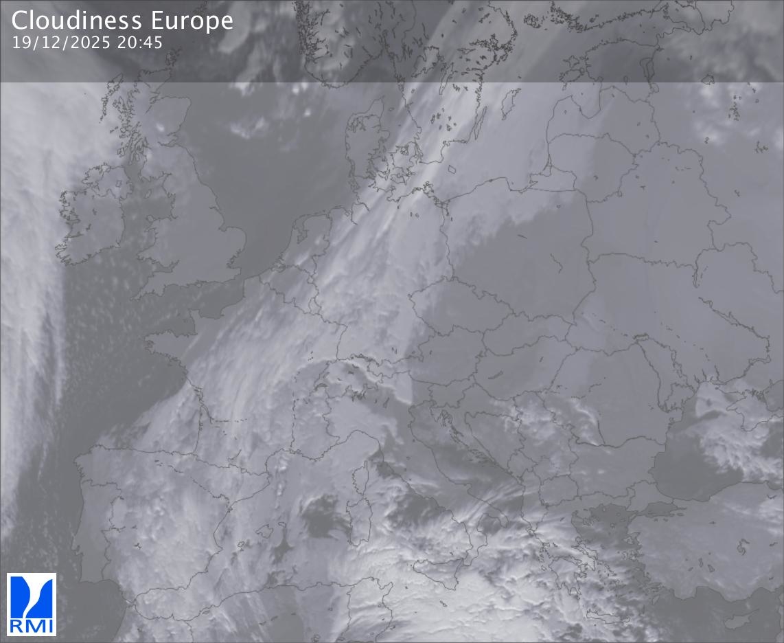 The satellite image of Europe is composed by using both the infrared and the visible light channel from the satellite. Because there are no usable visible light images during the night this composition of channels gives us an image that can be used to observe the clouds by day and by night. The pixelated artifacts are due to the lower resolution of the infrared channel.