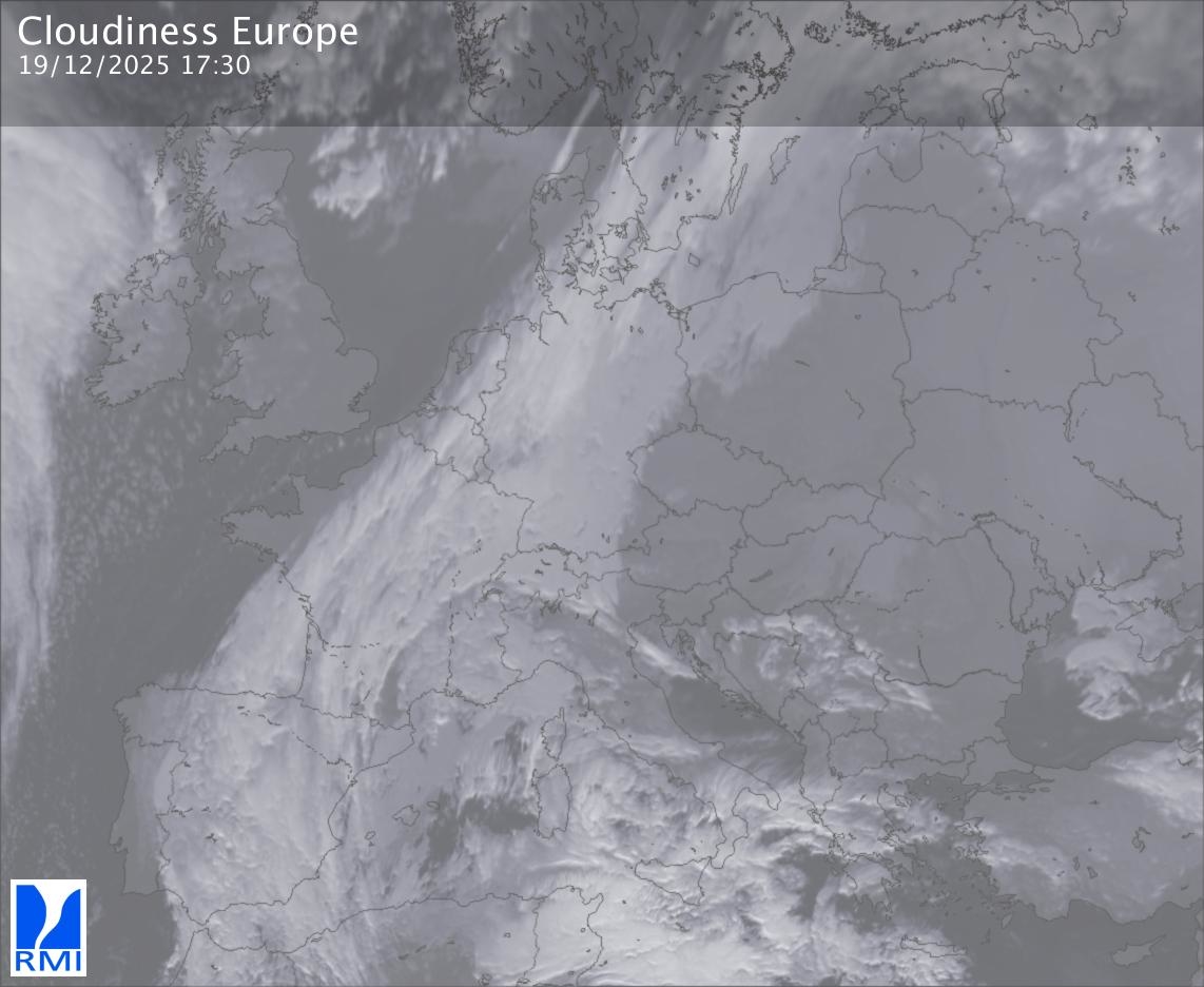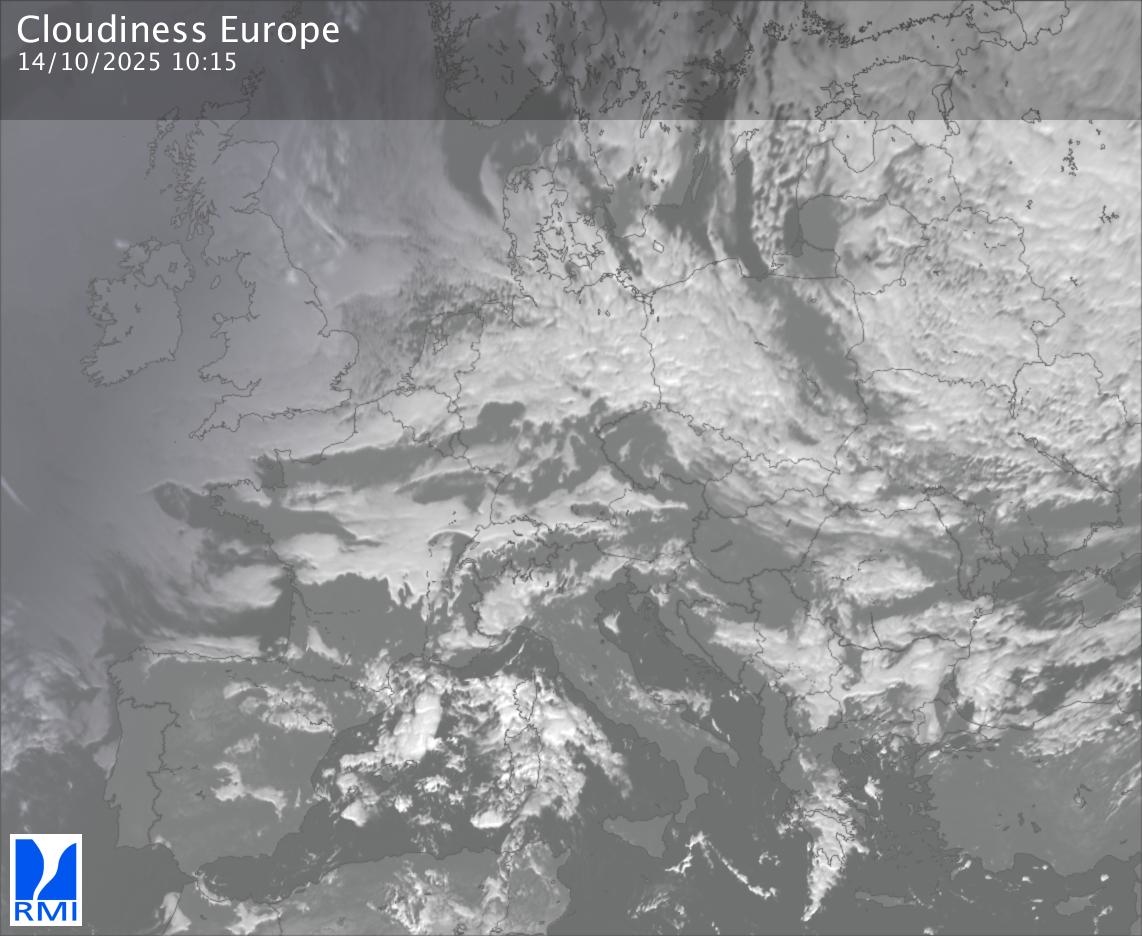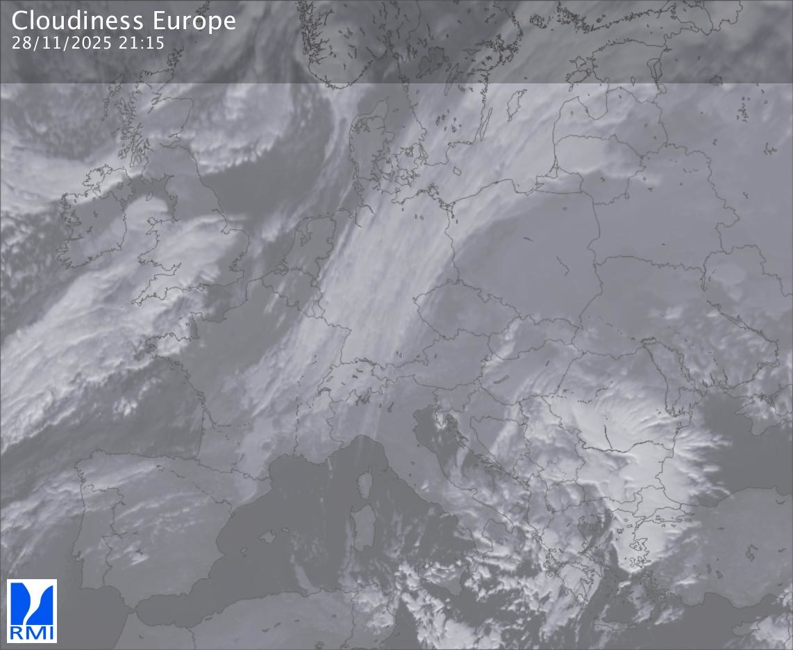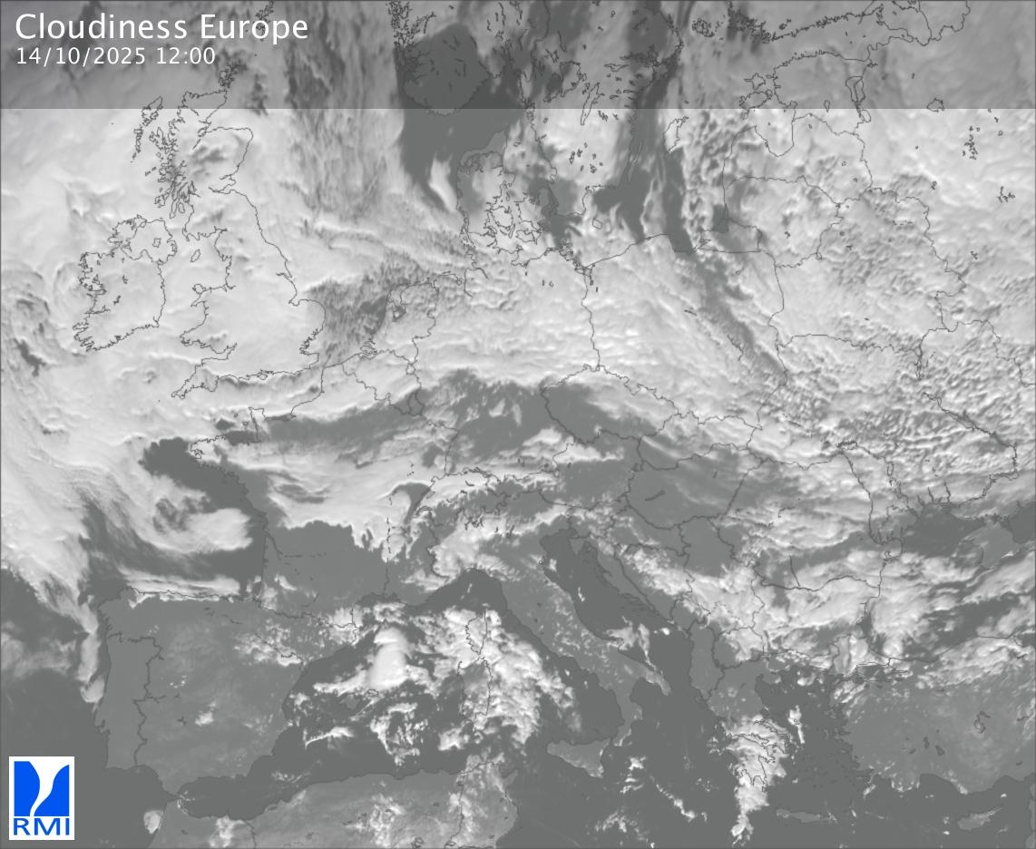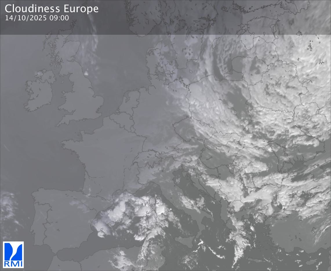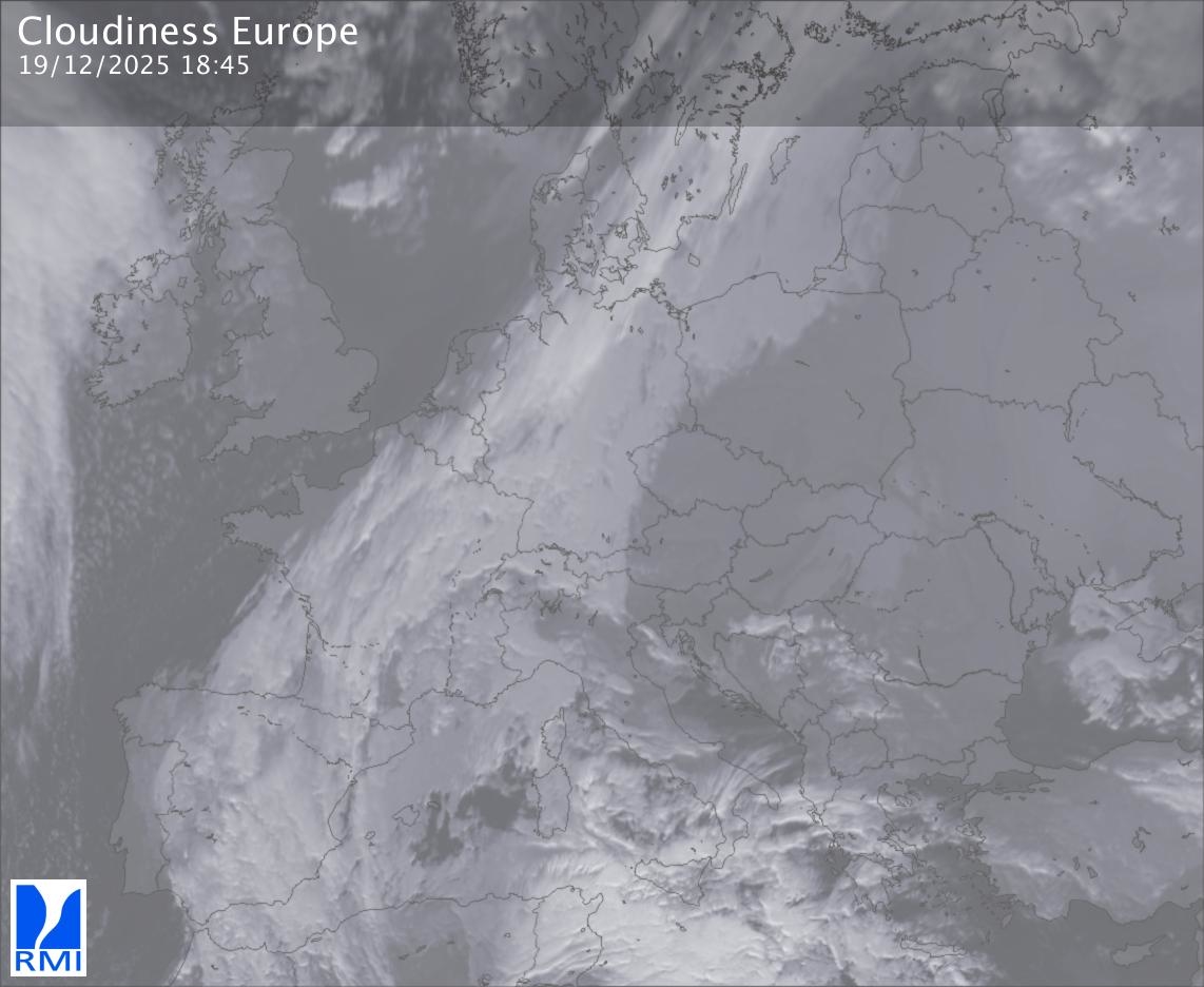 The satellite image of Europe is composed by using both the infrared and the visible light channel from the satellite. Because there are no usable visible light images during the night this composition of channels gives us an image that can be used to observe the clouds by day and by night. The pixelated artifacts are due to the lower resolution of the infrared channel.