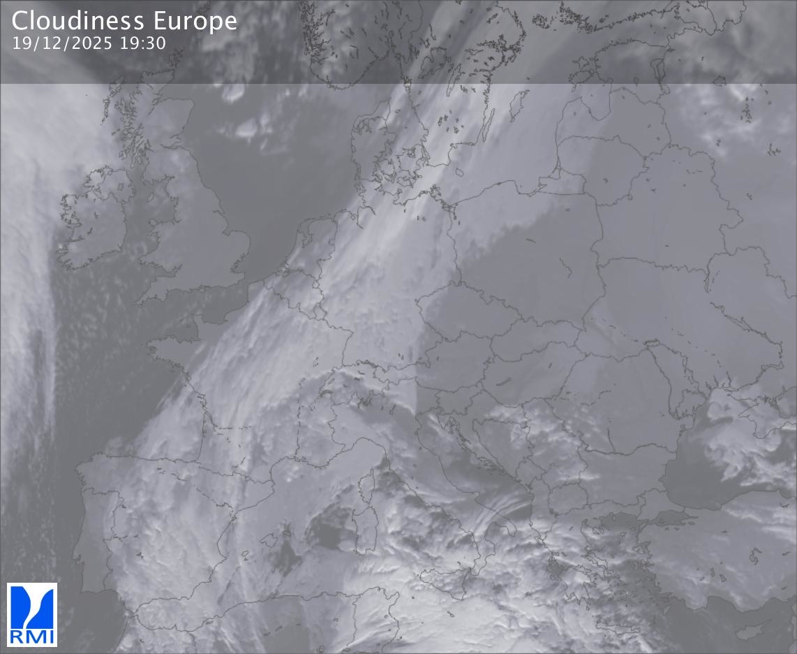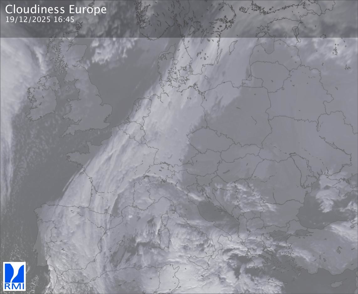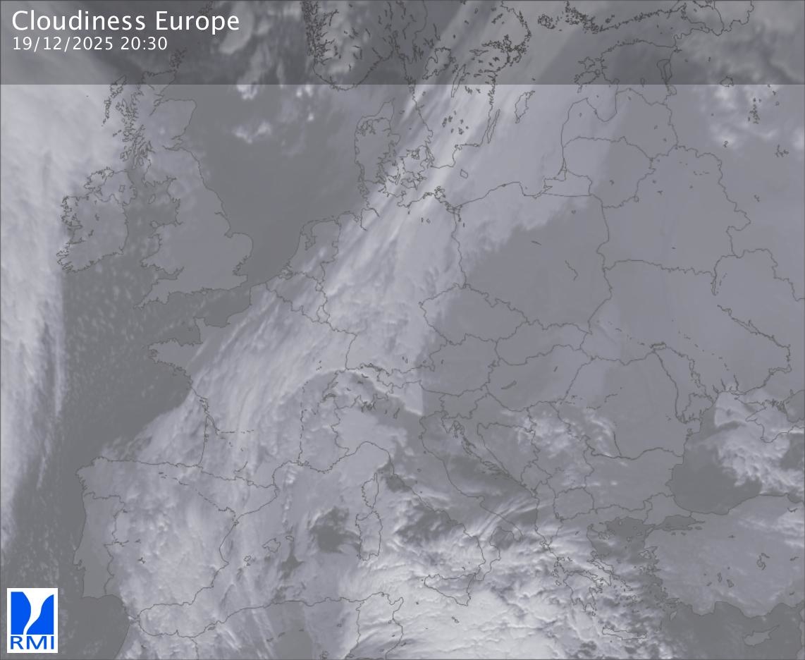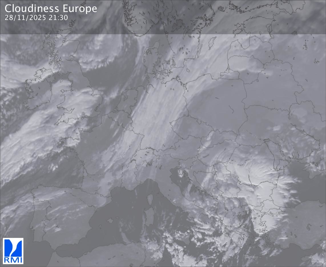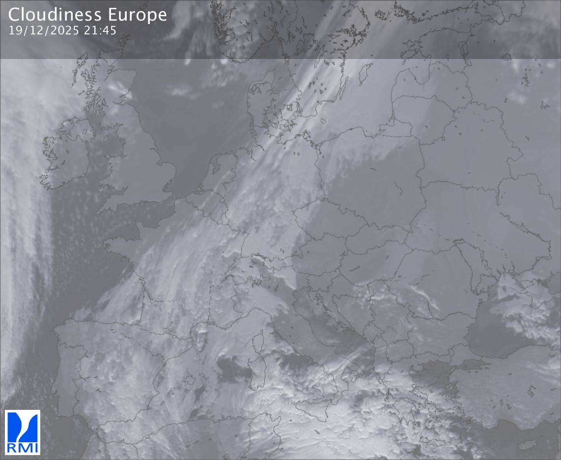 The satellite image of Europe is composed by using both the infrared and the visible light channel from the satellite. Because there are no usable visible light images during the night this composition of channels gives us an image that can be used to observe the clouds by day and by night. The pixelated artifacts are due to the lower resolution of the infrared channel.