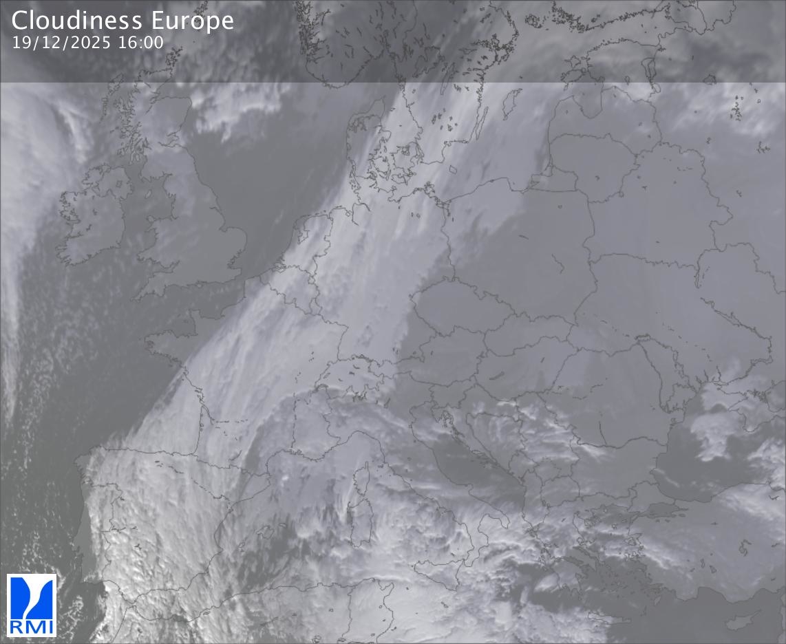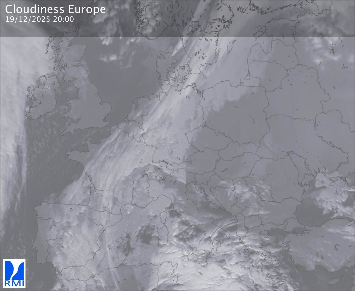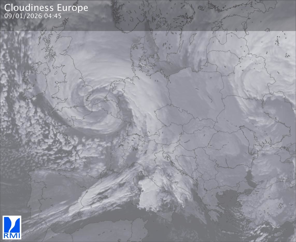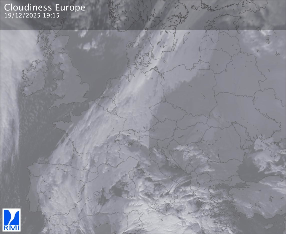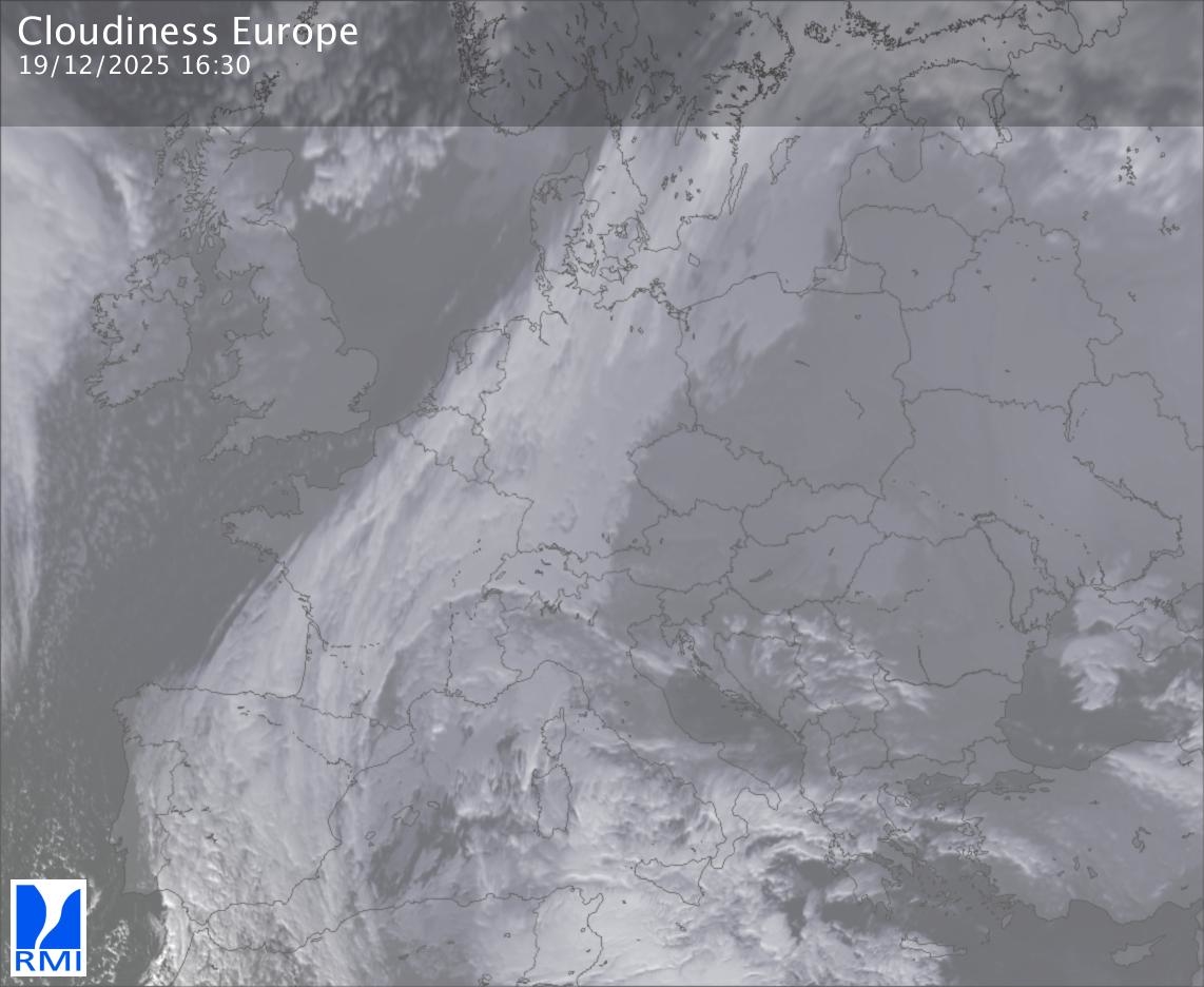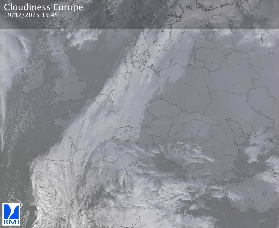 The satellite image of Europe is composed by using both the infrared and the visible light channel from the satellite. Because there are no usable visible light images during the night this composition of channels gives us an image that can be used to observe the clouds by day and by night. The pixelated artifacts are due to the lower resolution of the infrared channel.