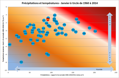 Remarque : à partir du bilan climatologique mensuel de janvier 2011, les normales et les valeurs record (+ et -) données dans le tableau ci-dessous sont calculées pour tous les paramètres sur la période 1981–2010. Cette période de 30 ans est la nouvelle période de référence choisie pour le calcul des normales (moyennes sur la période) à Uccle.
