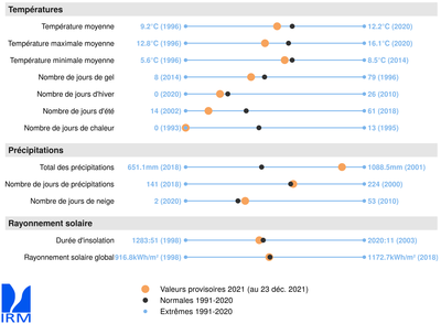 2021 a été l'année des extrêmes de précipitations et, contrairement à 2020, une année sans records de chaleur. Pour Uccle*, l'année écoulée peut être résumée comme une année très humide. D'autres régions du pays, comme de grandes parties de la Wallonie au cours du mois de juillet, ont également connu des inondations dues à des précipitations excessives. Bien que la température annuelle moyenne pour Uccle soit inférieure à la valeur normale (pour la période 1991-2020), l'année 2021 pour Uccle fait toujours partie de la liste des 30 années les plus chaudes depuis le début des mesures en 1833. À l'échelle mondiale, l'année 2021 figure parmi les dix années les plus chaudes.