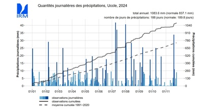 Il est intéressant de noter que cette valeur record annuelle va être établie alors que le nombre de jours de précipitations est actuellement de 188 jours (à la 132ème place dans le classement depuis 1833 en date du 26 novembre). Même s'il devait pleuvoir chaque jour jusqu'à la fin de l'année, ce qui ne sera probablement pas le cas, ce chiffre passerait alors à 224 jours, soit loin derrière le record de 1974 (266 jours). Avec 224 jours, on se situerait autour de la 26ème place du nombre de jours de pluie annuel le plus élevé. C’est donc le nombre élevé de jours (11 en 2024) avec des précipitations abondantes (égales ou supérieures à 20 mm) qui explique cette pluviométrie record.