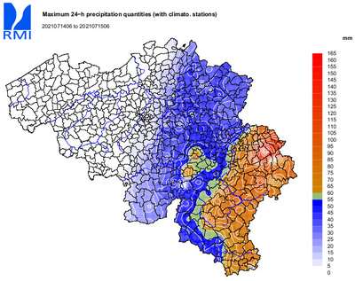 Les quantités de précipitations dont nous disposons pour l'instant, et relevées entre les 13 et 15 juillet dans l'est et le centre du pays, sont pour la plupart très abondantes et même extrêmes pour certaines. Pour les pluviomètres du SPW MI (Service Public de Wallonie - Mobilité et Infrastructures) de Jalhay (271,5 mm), Spa (217,1 mm) et Neu-Hattlich (189,0 mm), et celui du Mont Rigi de l'IRM (192,4 mm), les quantités relevées en 48h font état d'une période de retour largement supérieure à 100 ans. Le reste des mesures actuellement disponibles, comme visibles sur les cartes ci-dessous, font état de périodes de retour de telles quantités en 24 et 48h de minimum 30 ans.