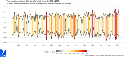 La figure ci-dessous montre depuis 1892, début des mesures de température, l'évolution de la période entre le premier et le dernier jour d'été de l'année. La figure montre qu'au cours des 20 dernières années, les périodes plus longues entre le premier et le dernier jour d'été sont devenues plus fréquentes. De plus, au cours des 30 dernières années, les derniers jours d'été sont tous tombés après le 1er août (contrairement au début de la série chronologique).