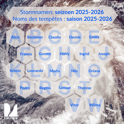 La Belgique fait partie du "groupe sud-ouest", aux côtés de la France, du Luxembourg, de l’Espagne et du Portugal. Chaque année, l’IRM collabore avec ces pays pour établir une nouvelle liste de noms. Depuis cette année, les météorologues d’Andorre participent également à ce processus. À l’image de la méthode utilisée pour les ouragans en Amérique, les noms sont attribués selon l’ordre alphabétique, en alternant prénoms masculins et féminins.