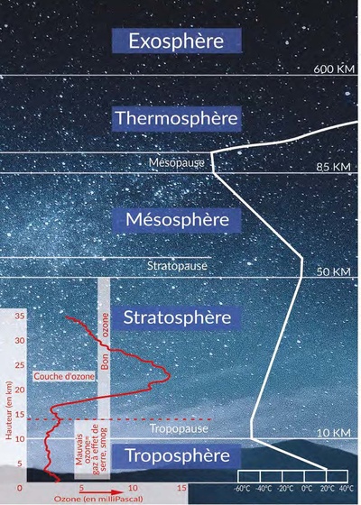Répartition de l'ozone (ligne rouge) et de la température (ligne blanche) selon l'altitude dans l'atmosphère