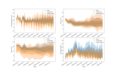 Une prévision d'ensemble typique produite le premier novembre 2020 par le post-traitement pour la station météorologique d'Elsenborn est présentée dans la figure ci-dessous. Pour toutes les variables, la prévision (brute en bleu, corrigée en orange) ainsi que les marges d’erreur de celle-ci sont améliorées par rapport aux observations en station (en vert). Ceci est particulièrement visible pour la prévision des rafales de vent, qui est considérablement décalée vers des valeurs plus petites, plus proches des observations.