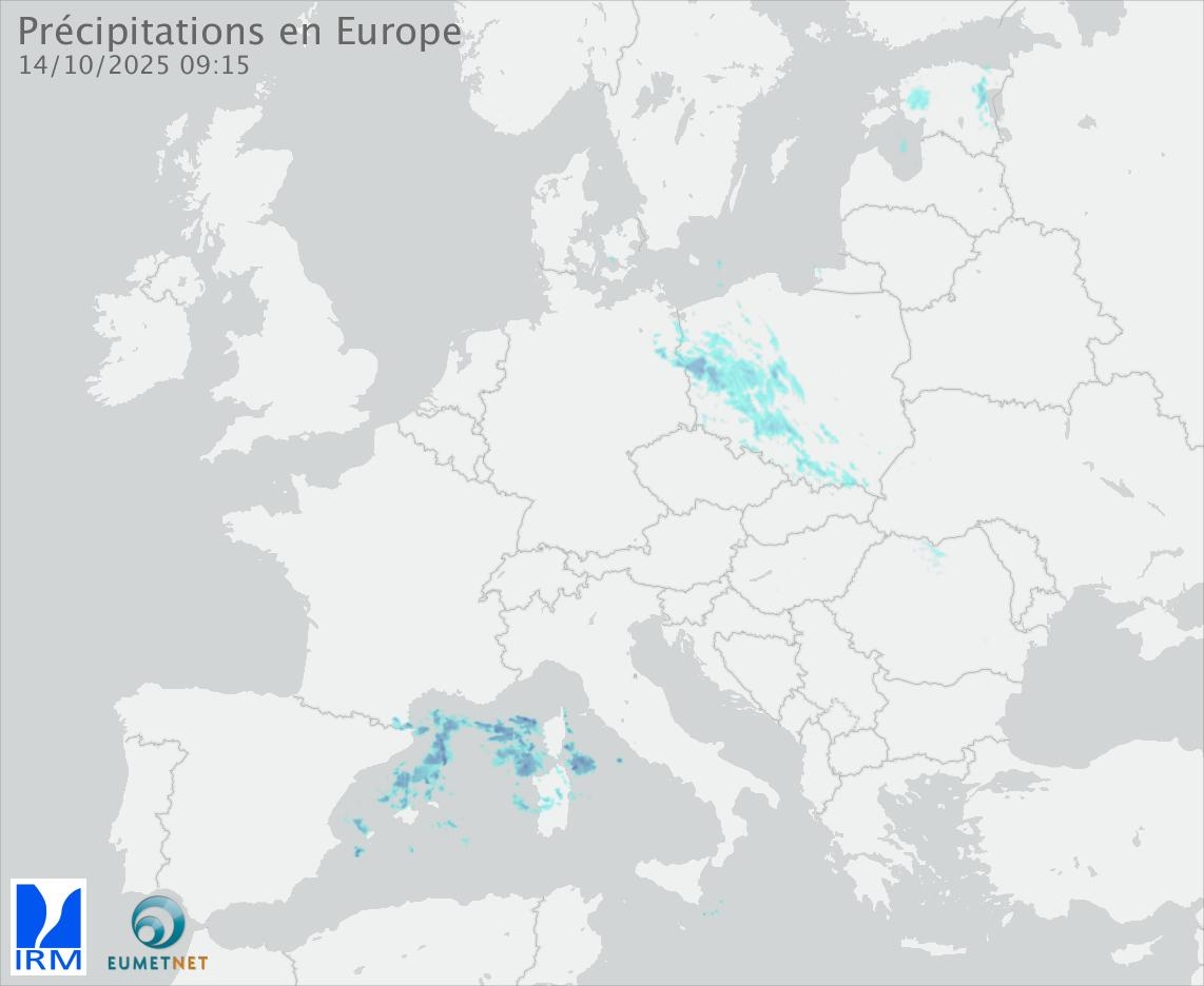 Cette animation montre les précipitations passées et présentes observées par les radars des participants européens au programme OPERA d'Eumetnet, par pas de 15 minutes.