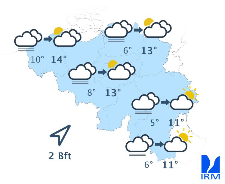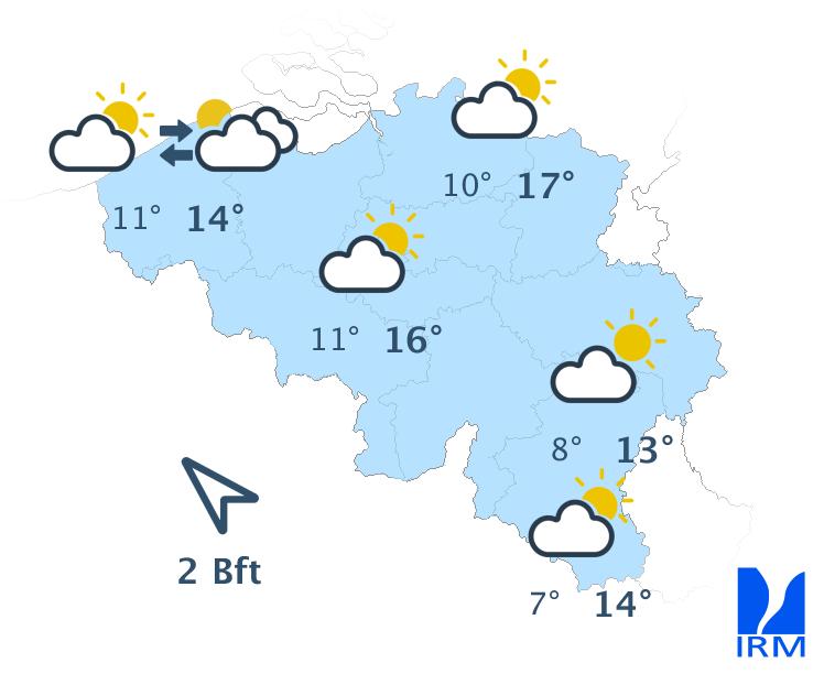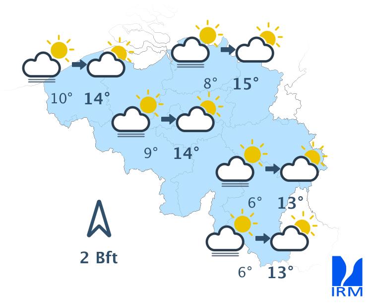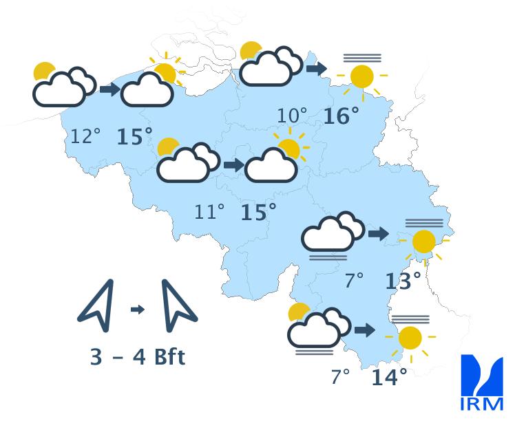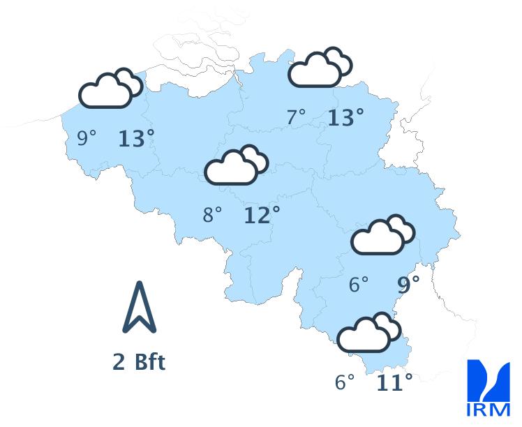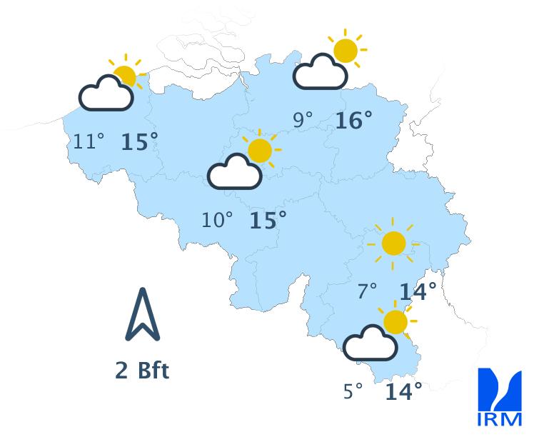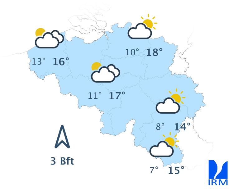 Ce soir, des éclaircies se développeront, principalement en basse et moyenne Belgique. Cette nuit, les éclaircies seront parfois larges, avant que la nébulosité n'augmente par l'ouest avec l'arrivée de nuages élevées mais aussi la formation de nuages bas en certains endroits. En Ardenne, de la brume ou un peu de brouillard pourront aussi se former. Les minima varieront de 6 degrés en haute Belgique à 12 degrés à la mer, sous un vent modéré de sud-sud-ouest.
