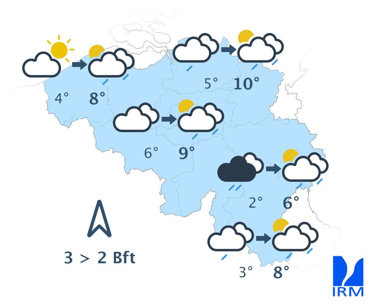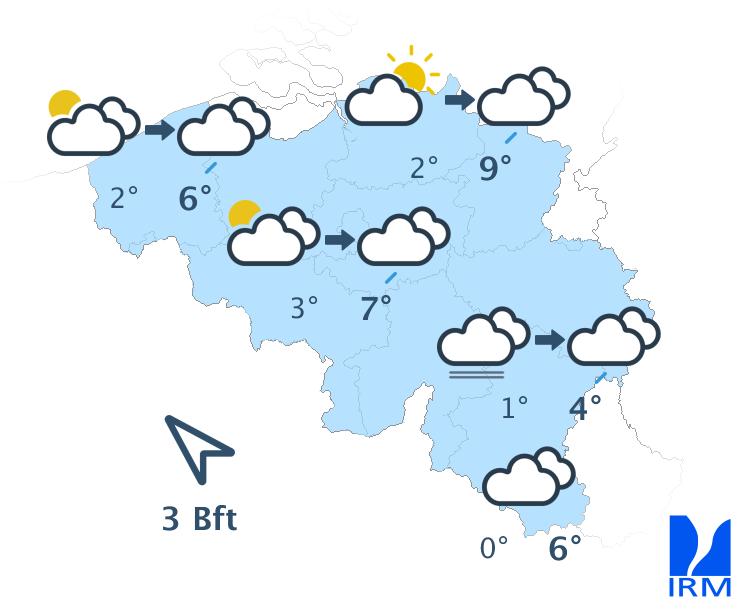 Dimanche matin, il fera très nuageux en Ardenne et en Lorraine belge avec un risque de brouillard. Ailleurs, la nébulosité sera temporairement plus variable. Le ciel s'ennuagera ensuite rapidement sur les autres régions et quelques averses (parfois sous forme de grésil) pourront à nouveau se produire localement. Les maxima se situeront entre 3 et 9 degrés sous un vent faible à régulièrement modéré de sud à sud-est.