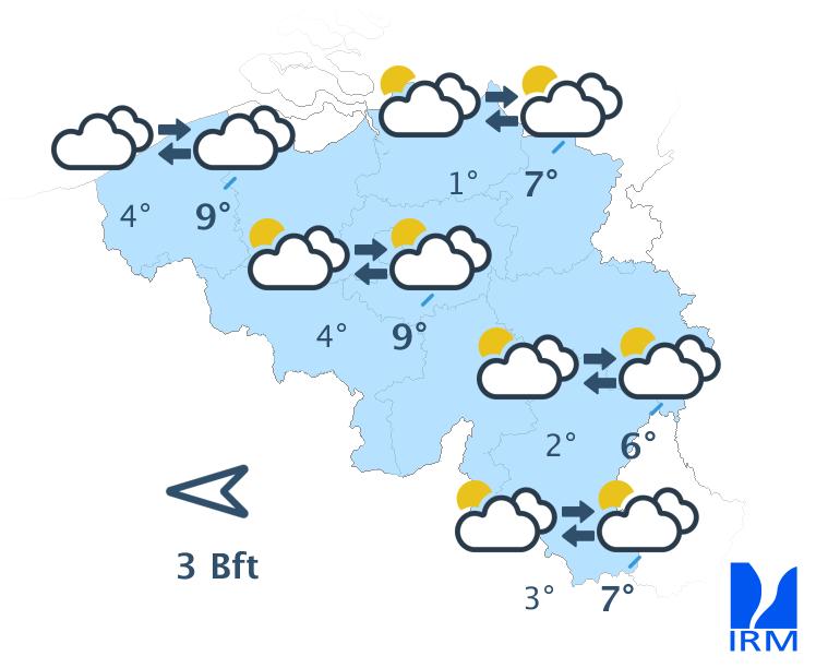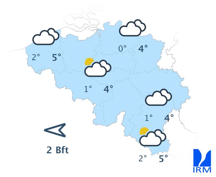 Samedi commencera avec quelques éclaircies dans l'ouest et beaucoup de nuages bas du centre à l'est du pays, avec un risque de brouillard en Ardenne. Quelques pluies seront également encore possibles sur l'est. Ensuite, le ciel deviendra partout partiellement à très nuageux avec la possibilité d'une averse. Les maxima oscilleront entre 5 et 10 degrés sous un vent faible à modéré de sud à sud-est.