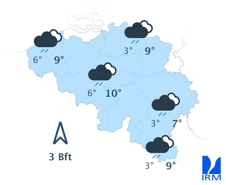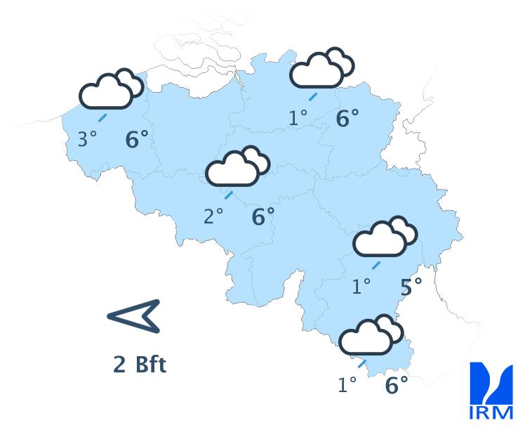 Ce soir, une nouvelle zone de pluie atteindra notre pays par la frontière française. Durant la nuit, elle progressera lentement vers le nord-est. A l'aube, quelques éclaircies pourraient se développer sur l'ouest du territoire. Les minima seront compris entre 1 et 6 degrés, sous un vent d'abord modéré de secteur sud-est, virant ensuite au secteur sud et devenant faible à modéré.