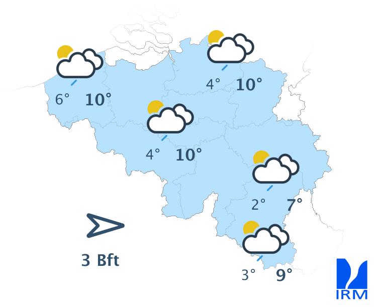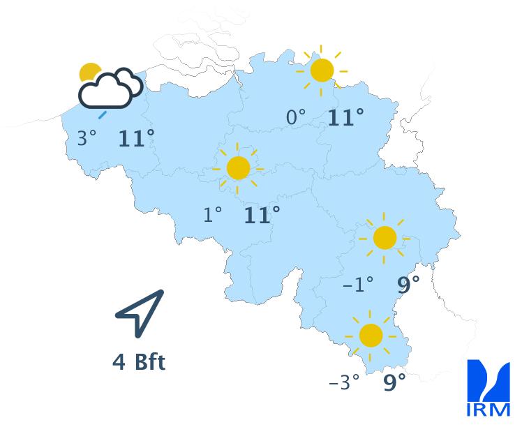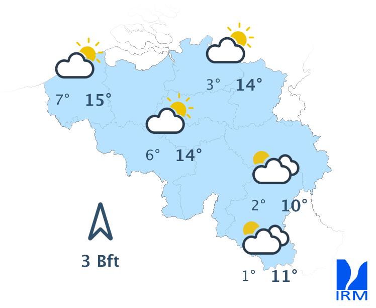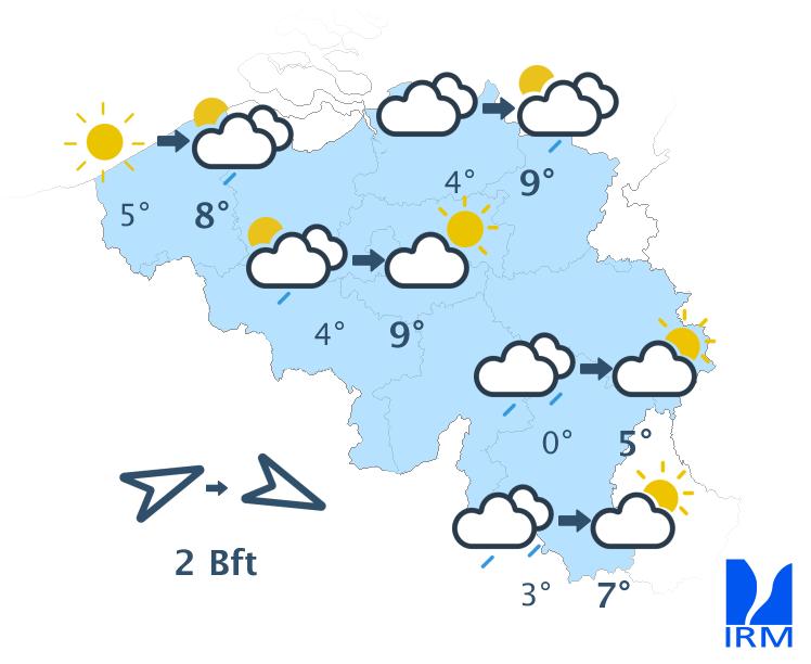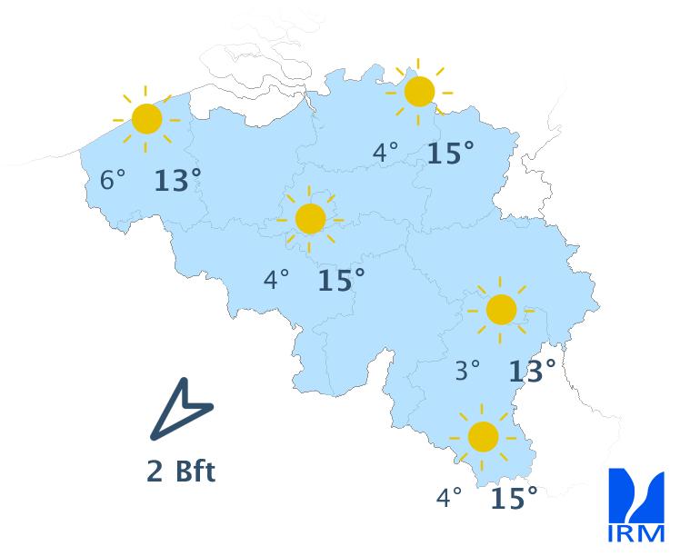 Dimanche matin, le temps sera assez froid, mais ensoleillé. La nébulosité augmentera ensuite à partir du littoral, puis la pluie fera son apparition sur l'ouest du pays en fin de journée. Les précipitations s'étendront à l'ensemble des régions en soirée et la nuit suivante. Les maxima varieront entre 8 degrés dans les Haute-Fagnes et 11 degrés en Basse Belgique. Le vent sera modéré de sud-ouest.