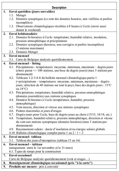 Le Service des Renseignements Météorologiques et Climatologiques vous propose différents produits standards disponibles sous forme d'abonnements.