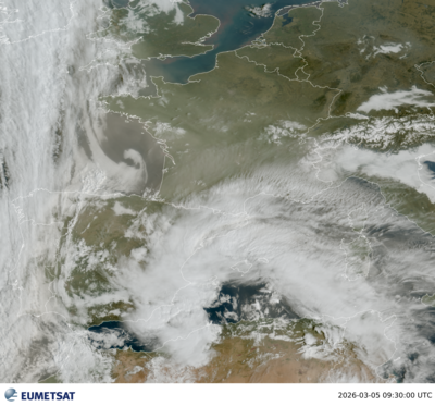 Satellietbeeld van EUMETSAT van 05/03/2026 om 9u30 waarop de belangrijkste stofdeeltjes zich boven het zuidoosten van Frankrijk en boven de Middellandse Zee bevinden. Deze gaan gepaard met een wolkendek dat bij zonsopgang een korrelige structuur vertoont, typisch voor wolkenvelden die woestijnstof bevatten.