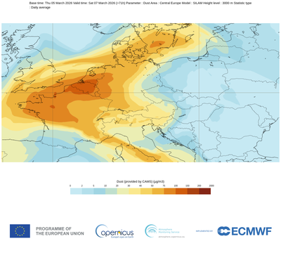 Modellering door SILAM (CAMS) van 05/03/2026 voor 07/03/2026 van de woestijnstof op 3000 m hoogte.