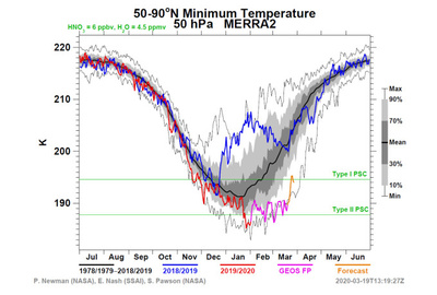 Boven de noordpool doet zich dit voorjaar exact het tegenovergestelde voor: daar bereiken de temperaturen op een hoogte van zo’n 20 kilometer boven de noordpool minimumrecordwaarden (zie figuur 2) en is de poolwervel dit jaar exceptioneel sterk. Ook nu nog, wanneer met de lente ook het zonlicht terugkeert boven de noordpool, zijn er nog steeds parelmoerwolken in de poolwervel, ook al een eerder uitzonderlijke situatie, waardoor er een gat in de ozonlaag ontstaat (zie figuur 3). De aanwezigheid van een echt ozongat boven de noordpool is buitengewoon: dergelijke gaten werden enkel in de jaren 1997 en 2011 gevormd (ruwweg 1 keer per decennium dus), waarbij het huidige ozongat het sterkste van de drie lijkt te worden. Met het zonlicht zullen de temperaturen boven de noordpool stijgen, zullen de parelmoerwolken oplossen en zal het ozongat weer vanzelf verdwijnen de komende weken.