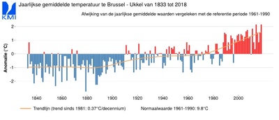 - Een stijging van de jaarlijkse gemiddelde temperatuur sinds de jaren '70 met een trend van 0.37°C/decennium (dus ongeveer +1.3°C tussen 1981 en 2018)