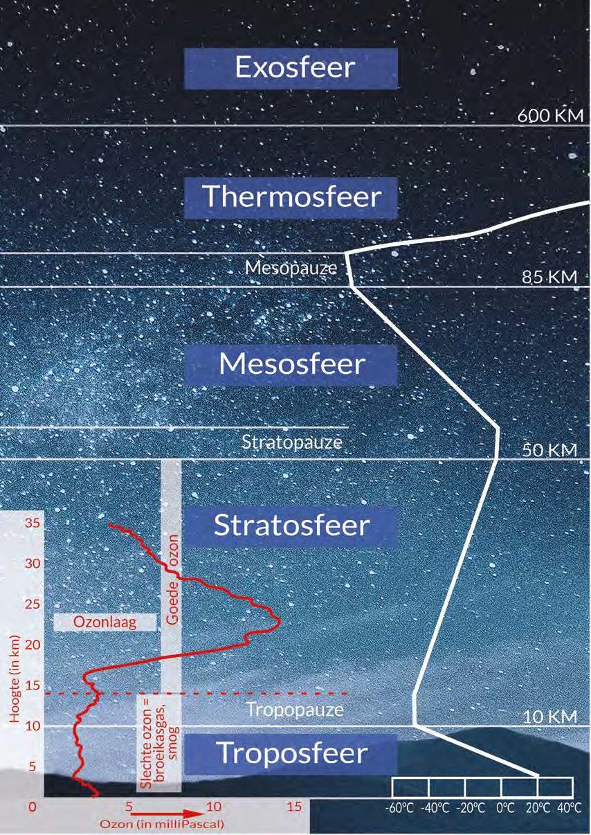 Verticale verdeling van ozon (rode lijn) en temperatuur (witte lijn) volgens de hoogte in de atmosfeer