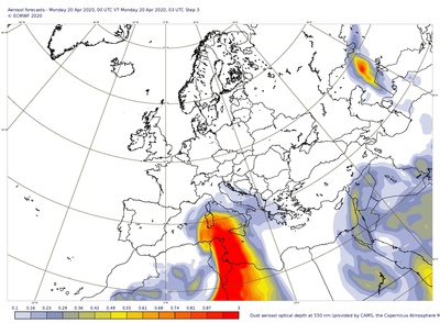 De kaart met voorspellingen van de aerosol concentraties toont aan dat er een stofpluim (aangeduid in het rood op de kaart) van de Sahara richting het westen van de Middellandse Zee trekt.