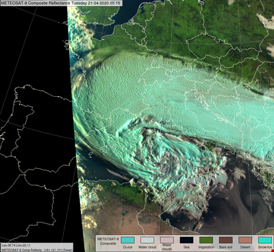 In de ochtend van 21 april observeerden onze voorspellers een schoolvoorbeeld van hoge bewolking van het type cirrus of cirrostratus over het zuidelijke gedeelte van Europa. Deze granulaire structuur in de wolken ontstaat als gevolg van een hoge concentratie aerosolen.