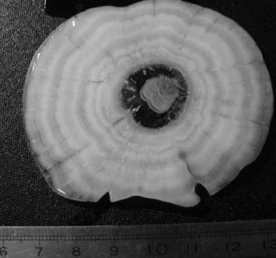 Hagel 2 : Wanneer een hagelsteen wordt doorgesneden is de gelaagde structuur goed zichtbaar. Centraal in de hagelsteen bevindt zich de 'hagel-embryo' waar rond de hagelsteen vervolgens verder groeide.