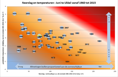 | Gemiddelde temperatuur | °C | 16,5 | 16,2 | n | 19,3 | 2003 | 13,2 | 1991 |