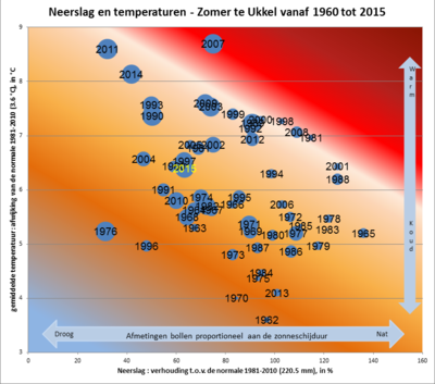 Hieronder vindt U het klimatologisch overzicht van de zomer van 2015 (juni 2015 tot augustus 2015) voor 4 parameters. Tevens wordt deze zomer vergeleken met de 5 meest extreme zomers voor elke parameter.