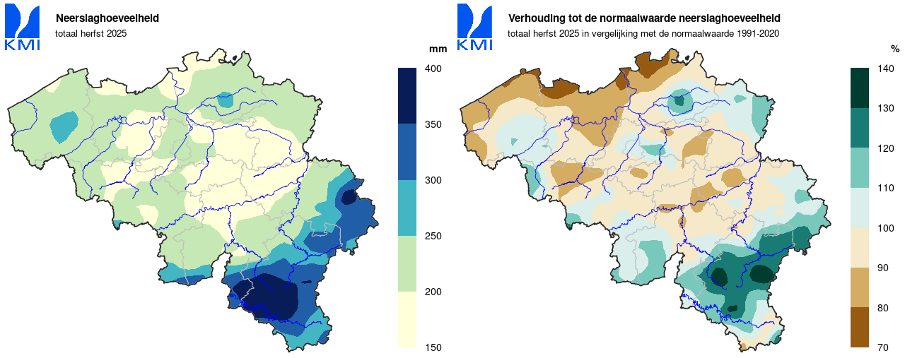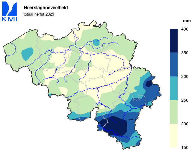 In totaal viel er in Ukkel de afgelopen herfst een beetje minder neerslag dan gemiddeld: 201,9 mm (normaal: 209,3 mm) op 51 dagen (normaal: 48,5 dagen).