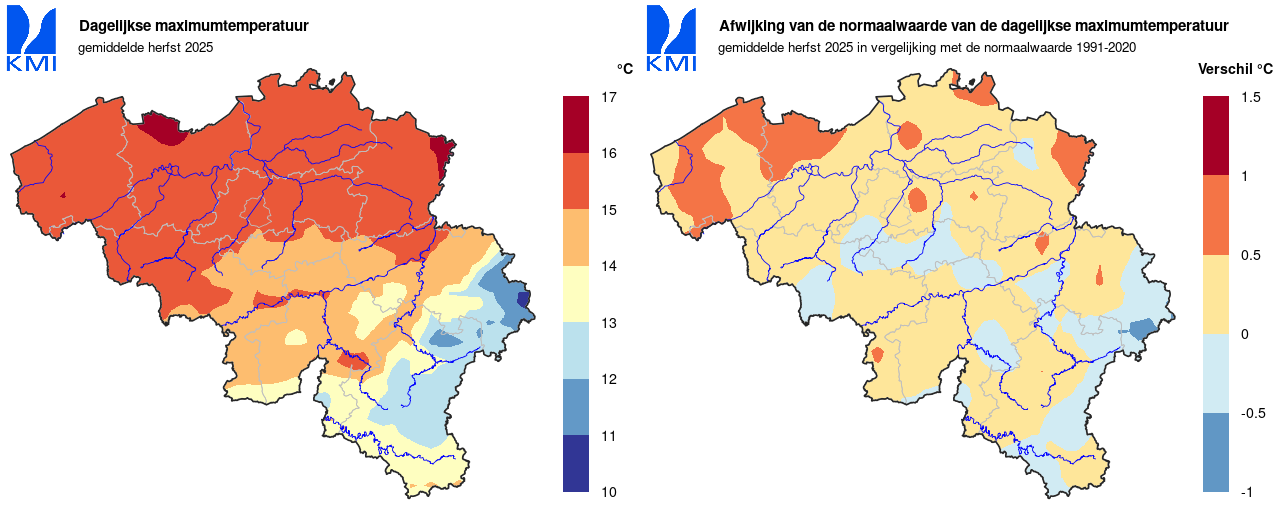 De herfst van 2025 was warmer dan normaal met een gemiddelde temperatuur van 12,0°C (normaal: 11,2°C).