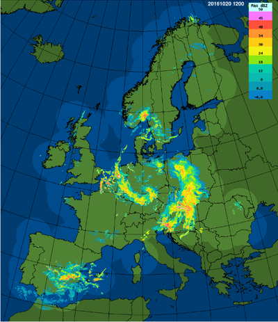 De radars van het KMI en de VMM zijn opgenomen in het Europese radarnetwerk dat momenteel meer dan 200 radars omvat. De gegevens van deze radars worden in realtime verzameld om elke 15 minuten een samengesteld radarbeeld te vormen dat heel Europa bestrijkt. Dit beeld maakt het mogelijk om de evolutie van neerslag op een continentale schaal te volgen.