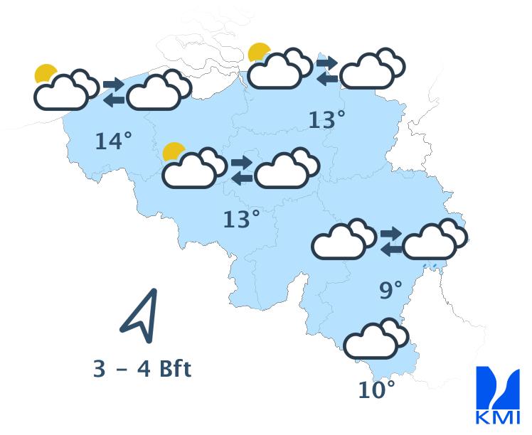 Morgen blijft het droog met zon en wolkenvelden. In de Ardennen is er aanvankelijk nog ochtendgrijs. In de namiddag zijn er voornamelijk hoge en middelhoge wolkenvelden. De maxima liggen tussen 10 graden in de Hoge Venen en 16 graden in de Kempen. De wind waait matig uit het zuidzuidwesten en krimpt naar het zuidzuidoosten.