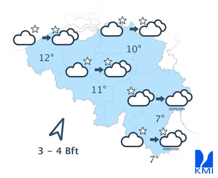 Vanavond klaart het gedeeltelijk op, vooral in Laag- en Midden-België. Vannacht zijn er soms brede opklaringen maar geleidelijk neemt de bewolking toe door de aankomst van hoge wolkenvelden vanaf het westen en elders door de vorming van lage wolkenvelden in sommige streken. In de Ardennen kan wat nevel of mist gevormd worden. De minima liggen tussen 5 graden in Belgisch Lotharingen en 12 graden aan zee. De wind waait matig uit het zuidzuidwesten.