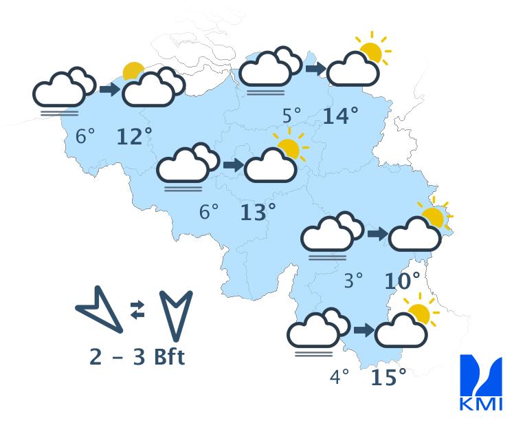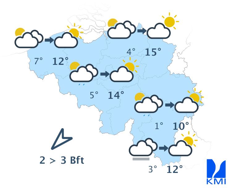 Dinsdagochtend hangt er in vele streken lage bewolking met plaatselijk kans op wat motregen. In de namiddag wisselen opklaringen en wolken elkaar af, waaruit plaatselijk een buitje kan vallen. Tegen de avond klaart het uit en wordt het droog. We halen maxima van 10 graden in de Hoge Venen tot 15 graden in Laag- en Midden-België. De noordoostenwind wordt matig en aan zee soms vrij krachtig.