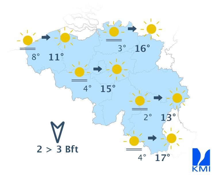 Dinsdagavond en -nacht is het helder. De minima liggen tussen 2 en 6 graden in de meeste streken, maar in de Ardennen is in sommige valleien lichte vorst mogelijk. De wind is zwak tot matig en aan zee matig uit oostnoordoost.