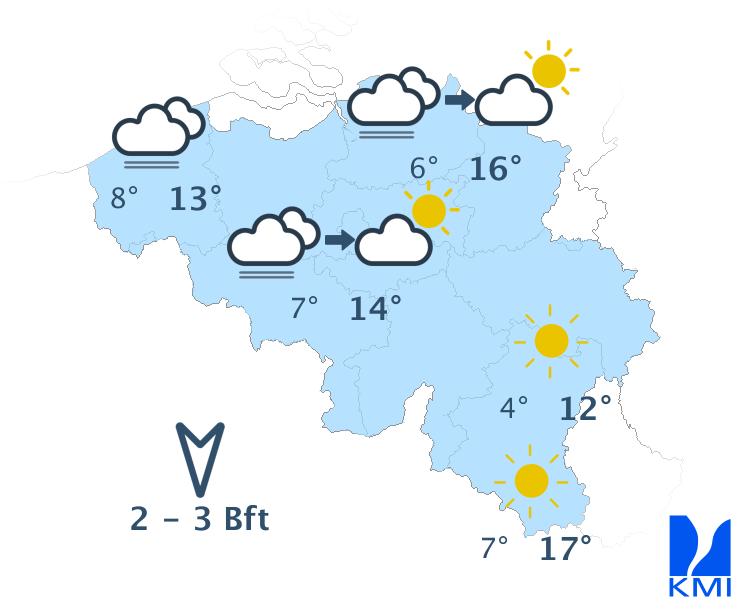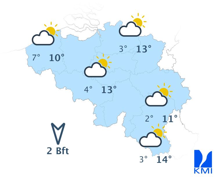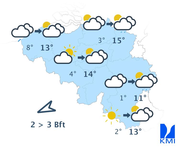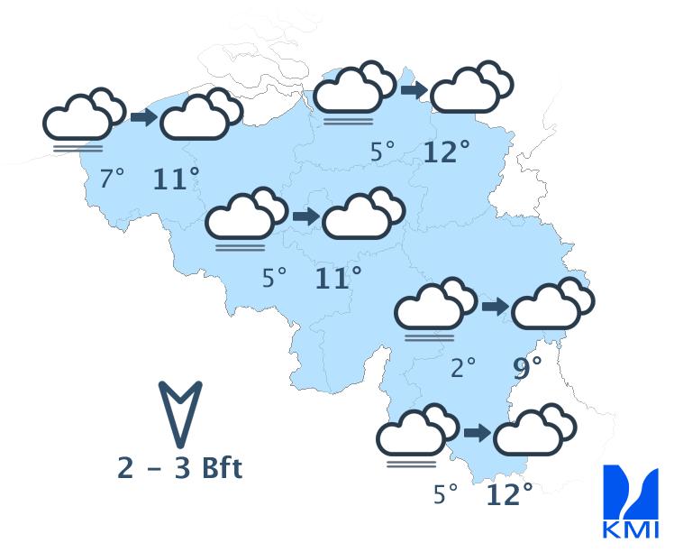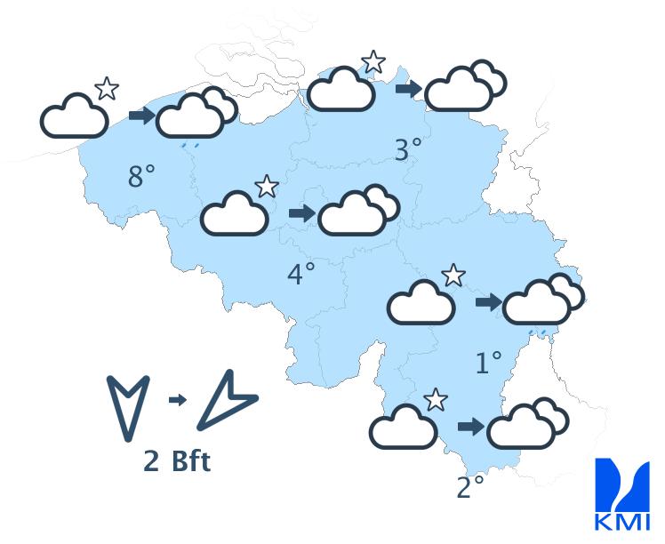 Vanavond en aan het begin van de avond is het droog met alsmaar bredere opklaringen. Na middernacht komt er meer bewolking opzetten vanaf de Noordzee met kans op enkele buitjes ten noorden van Samber en Maas. In het zuiden van het land blijft het grotendeels droog met kans op nevel en een slecht zicht op de Ardense toppen. De minima liggen tussen -2 graden in sommige Ardense valleien en +8 graden aan zee. De wind wordt zwak tot soms matig in het binnenland en matig aan zee uit het noordoosten.