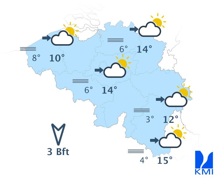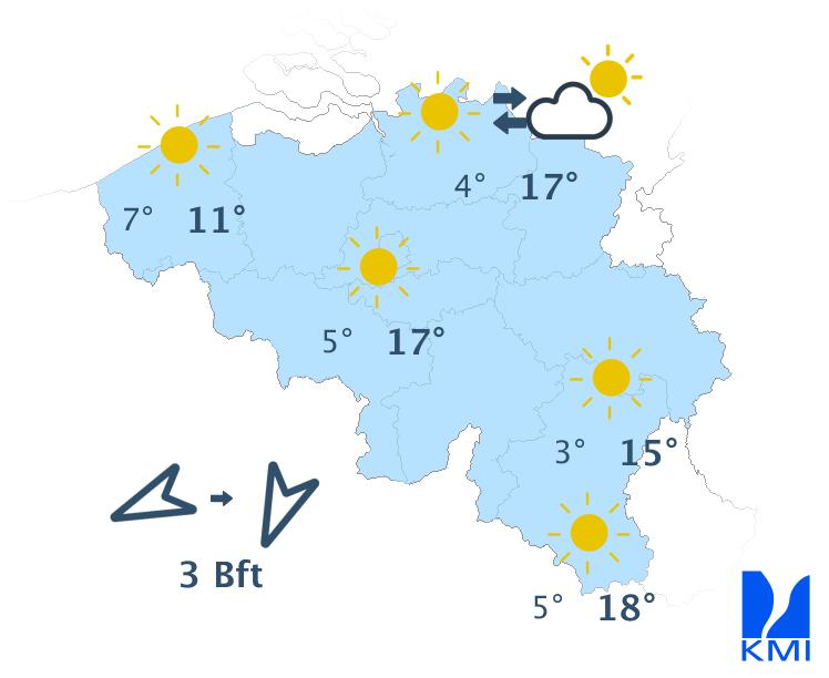 Woensdag is het zonnig met maxima van 12 graden in de Hoge Ardennen en 16 tot 18 graden in Laag-België. De wind is matig uit oostnoordoost en aan zee soms vrij krachtig uit noordoost.