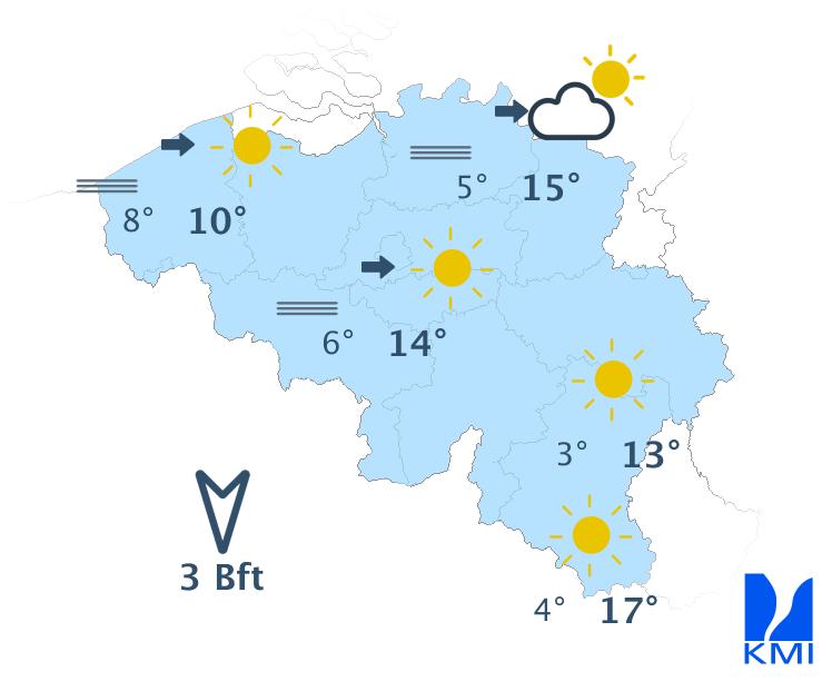 Vrijdag start met wijdverspreide nevel, mist of lage bewolking. Dit lost snel op en nadien wordt het in de meeste streken opnieuw zonnig. Vooral in het noorden kunnen er soms wat wolkenvelden voorkomen. De maxima schommelen tussen 12 graden vlak aan zee en 18 graden in Belgisch Lotharingen. De wind is zwak tot matig uit het noorden.