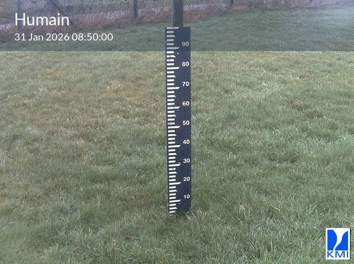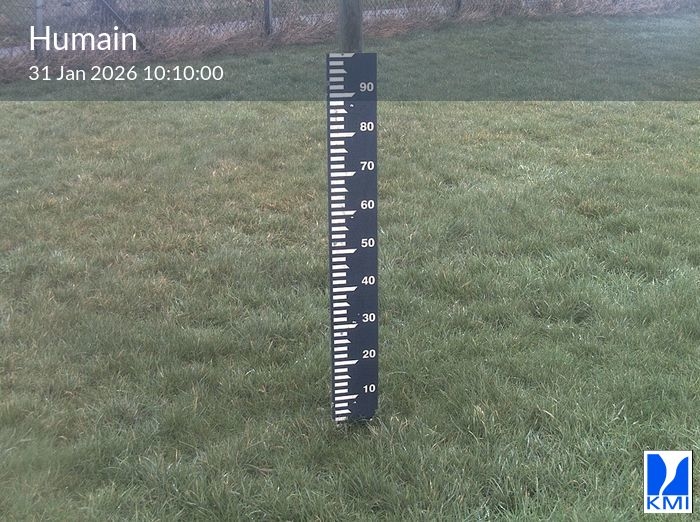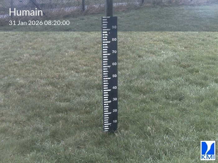 De meetlat op het beeld laat toe om de actuele sneeuwhoogte (in cm) in te schatten.